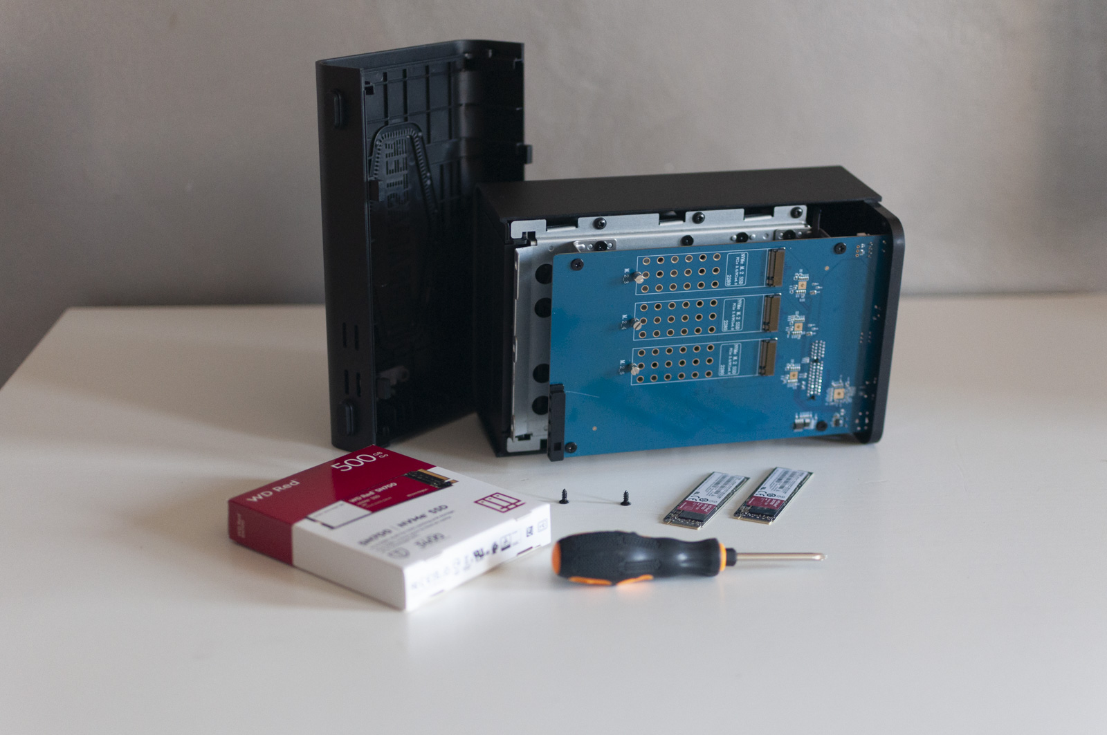 Nella confezione trova posto anche il cavo di collegamento, una serie di adesivi per etichettare le slitte, l’alimentatore esterno (ma piccolo) e una bustina con un cacciavite per il montaggio delle unità M.2.
