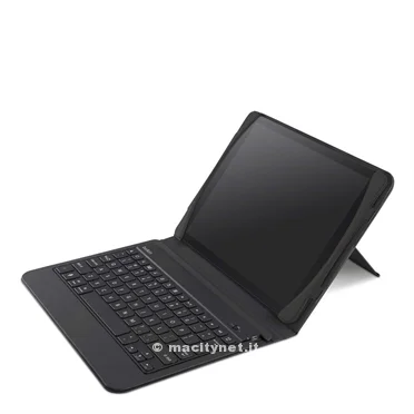 La QODE Slim Style Keyboard Case for iPad Air è una classica cover con tastiera Bluetooth incorporata, un sistema che ha una grande popolarità e che Belkin propone con non troppe varianti rispetto al fattore di forma classico. L’unico tocco di originalità è nel sistema con due alette ad elastico studiate per inserire e togliere l’iPad in maniera veloce. Il resto appare piuttosto usuale: abbiamo la tastiera collocata in una delle due altette e un supporto posteriore che funziona come nei portaritratti. Si apre e si chiude a seconda della necessità consentendo anche una modesta regolazione dell’inclinazione dello schermo.