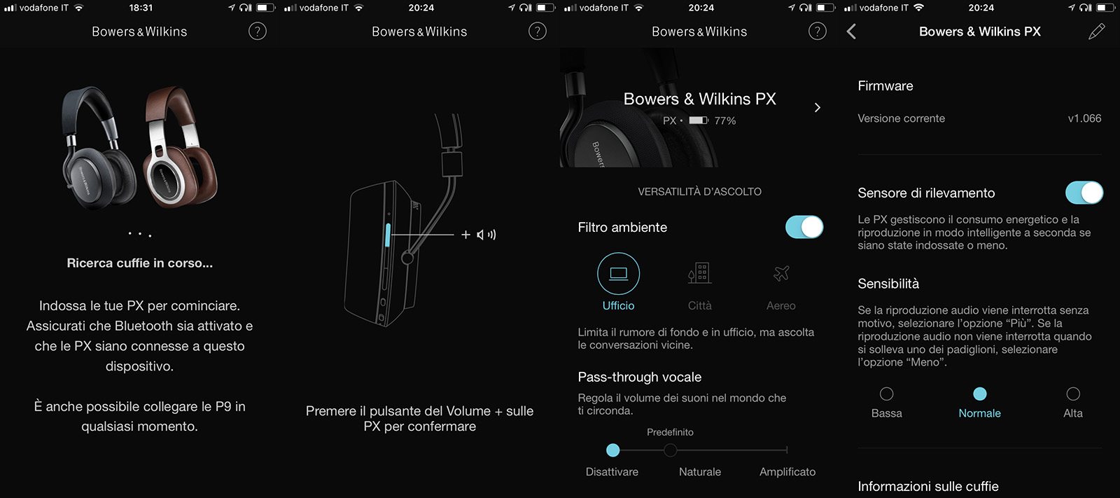 Una volta eseguito il pairing Bluetooth e avviata l’App, questa comunica con le cuffie modificando l’intervento del NC su tre situazioni ideali: Ufficio, Città e Aereo, e per ogniuna di esse permette un filtro Pass-through vocale modulabile in tre posizioni (dalla più bassa a sinistra, dove non passa nessuna voce a quella più alta, a destra, dove il range di frequenza è molto più morbido e passano diverse voci di contorno).