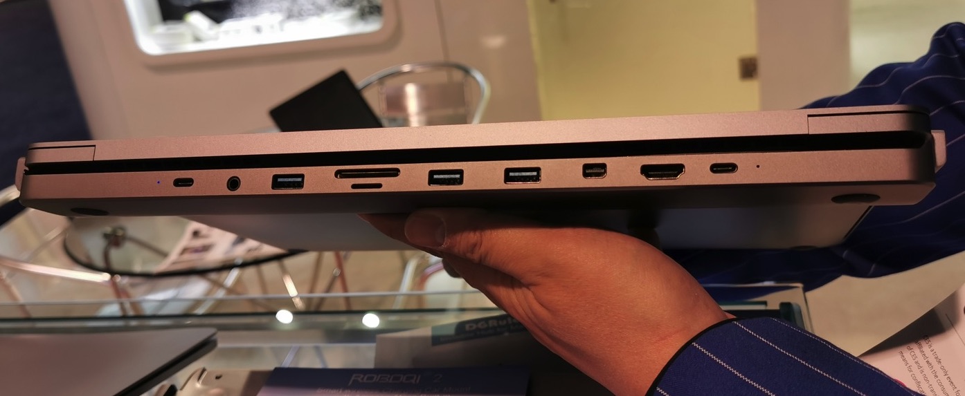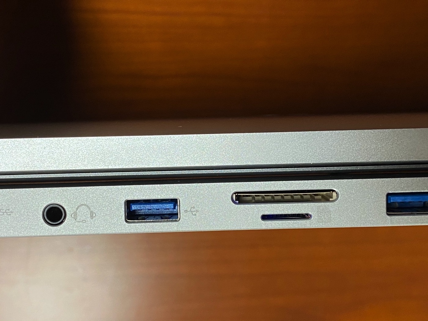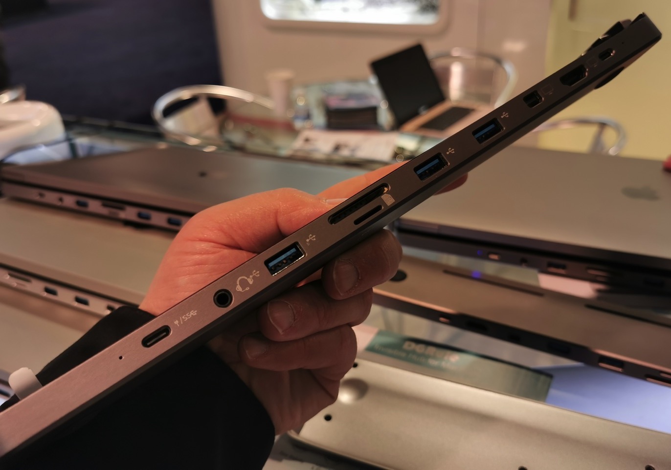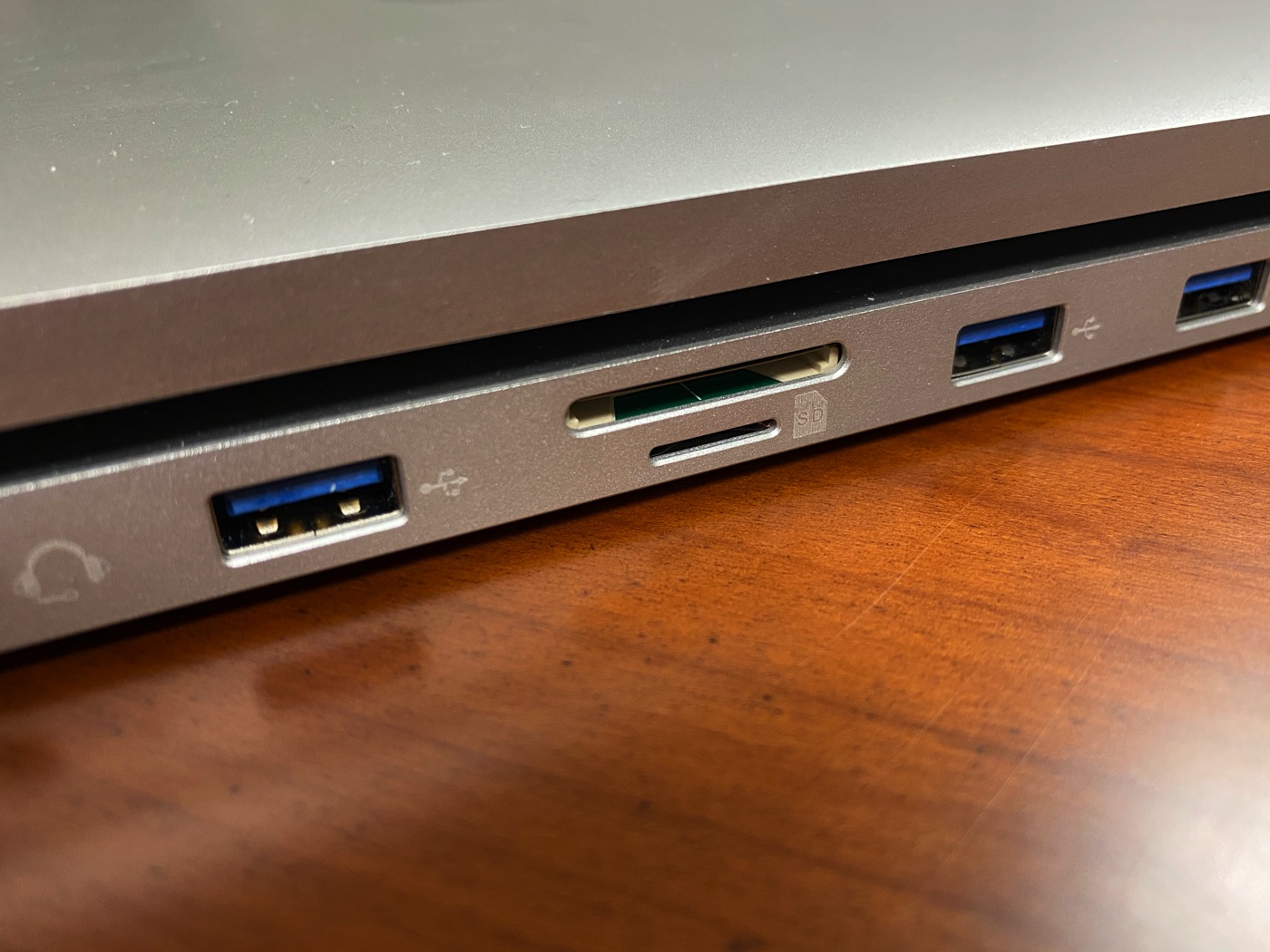 In aereo e in treno è sicuramente vantaggioso avere delle porte sul retro visto il pochissimo spazio laterale quando si viaggia in economy: sia l’alimentazione che le chiavette e i collegamenti vengono sfruttati in profondità e può essere pure utile avere il piano di appoggio rialzato. Sulla scrivania potrebbero esserci meno problemi ad usare le porte laterali ma qui ce ne sono ben 10 con la comodità di avere un lettore di card SD e micro SD che possono lavorare insieme e senza pericolosi dongle che pendono ai lati.