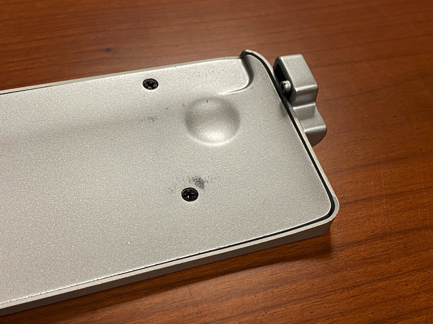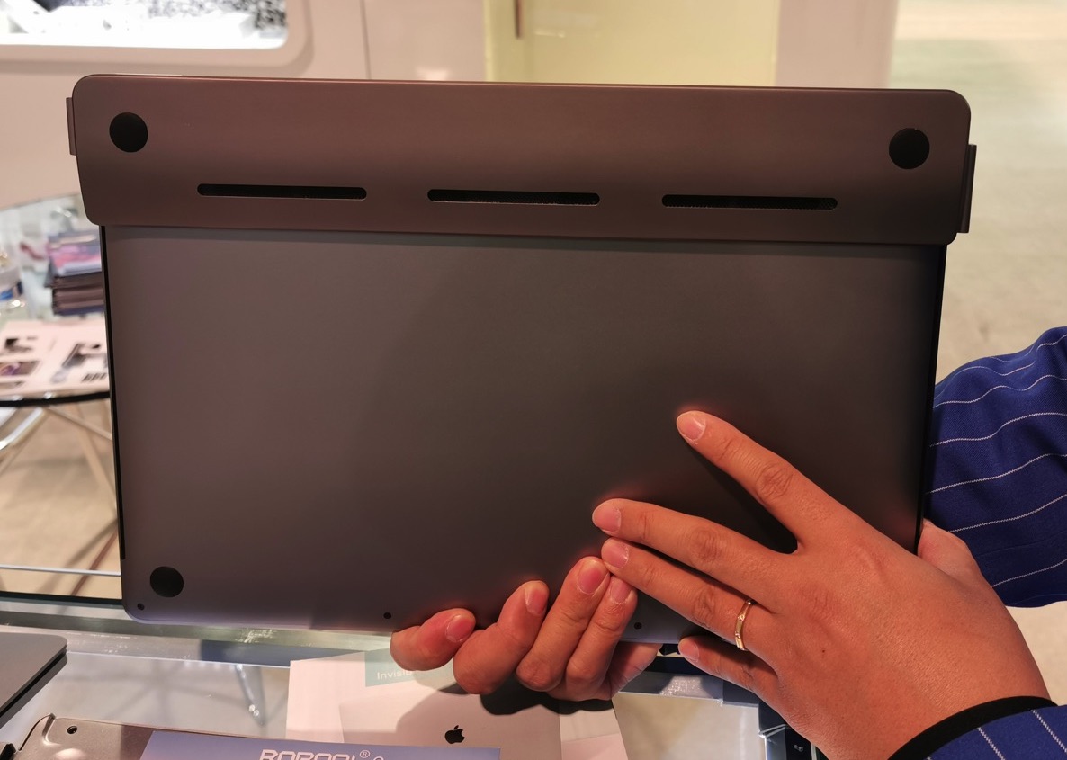 Nel prototipo che stiamo provando la parte sinistra (vista dal lato della trackpad) è rigida e va infilata facendolo scivolare verso destra mentre la parte destra è estraibile e reinseribile grazie ad un sistema a molla che funziona “a pinza”. Nella versione definitiva il lato sinistro si potrà leggermente inclinare per facilitare l’inserimento. Il materiale è alluminio anodizzato lavorato in CNC con ottima precisione e in due colori per adattarsi ai modelli di MacBook Pro argento e grigio siderale.