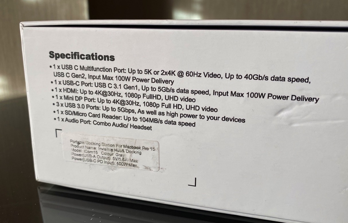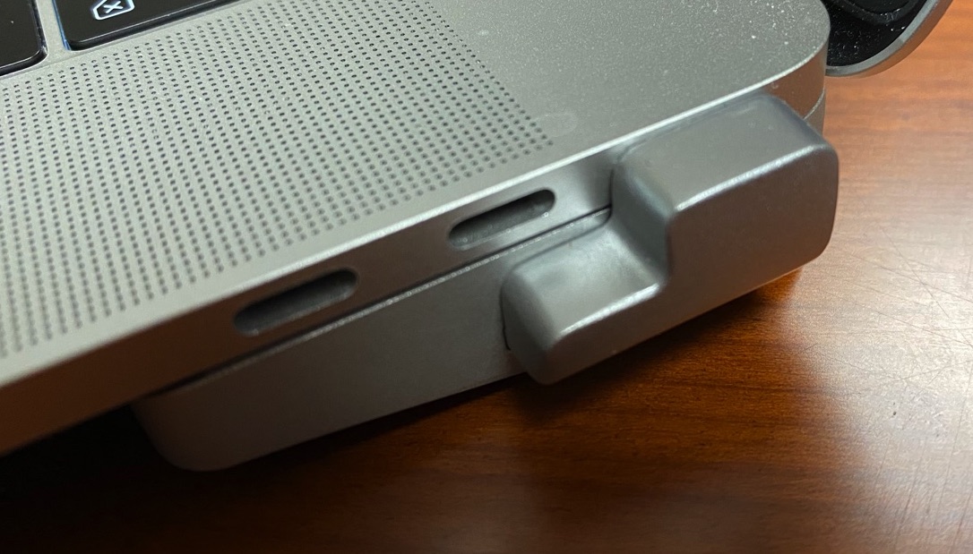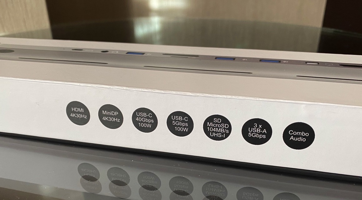 Dal punto di vista della disposizione e varietà delle prese si tratta di un dispositivo abbastanza standard, quello che invece è particolare è il sistema di aggancio al fondo del portatile che permette di farlo diventare solidale utilizzando due prese Thunderbolt 3 / USB-C su un fianco e il foro della cuffia dall’altro a mo’ di pinza.