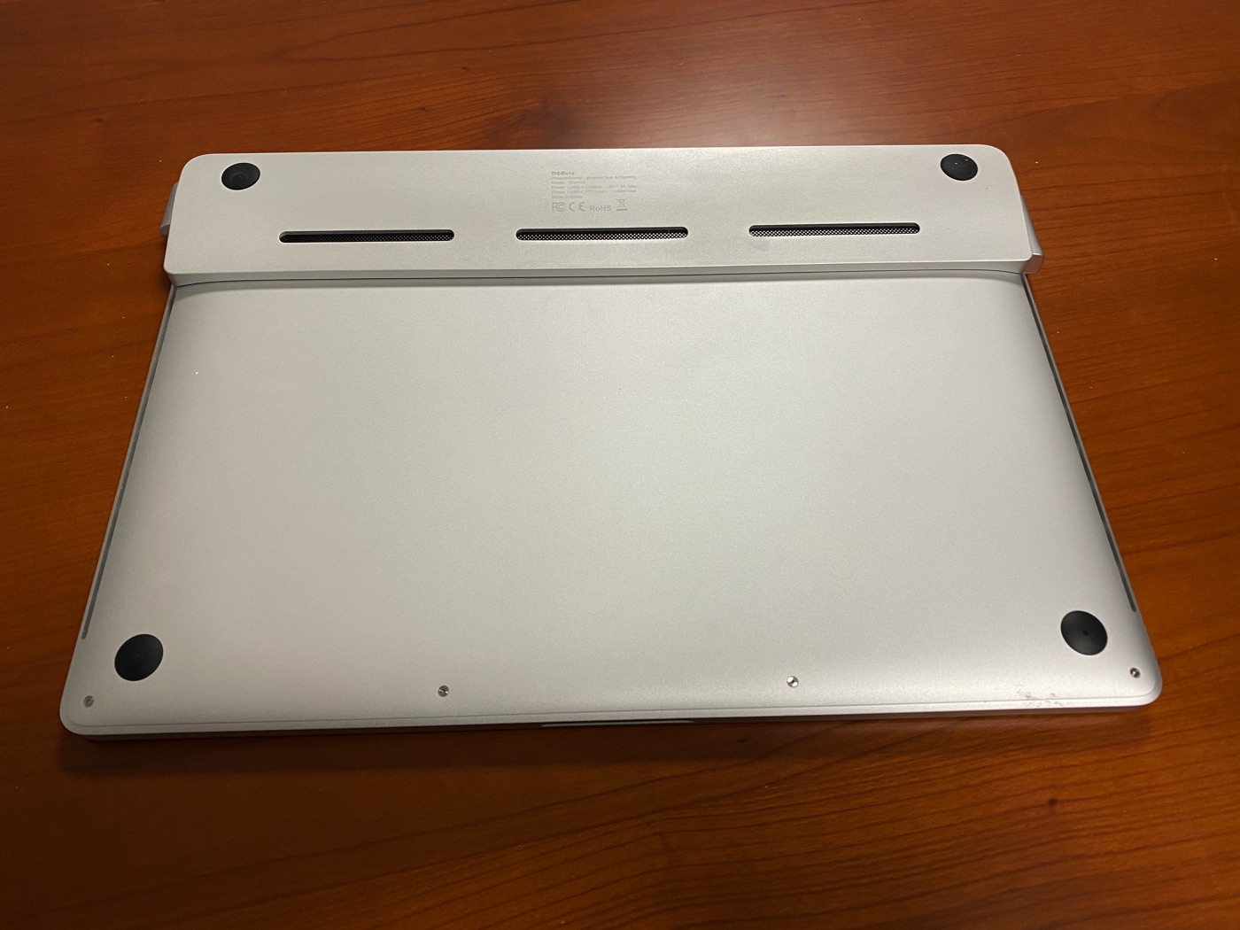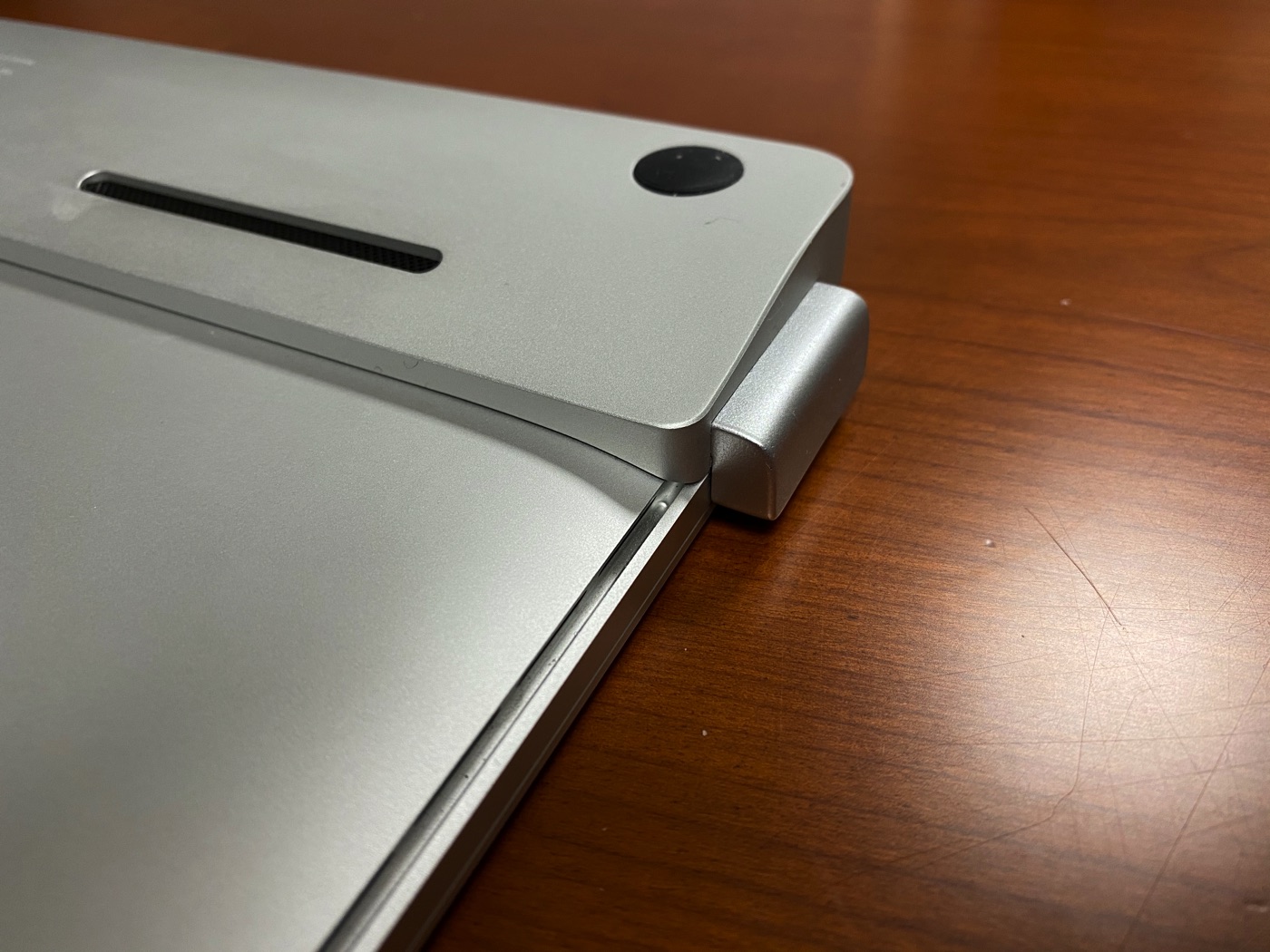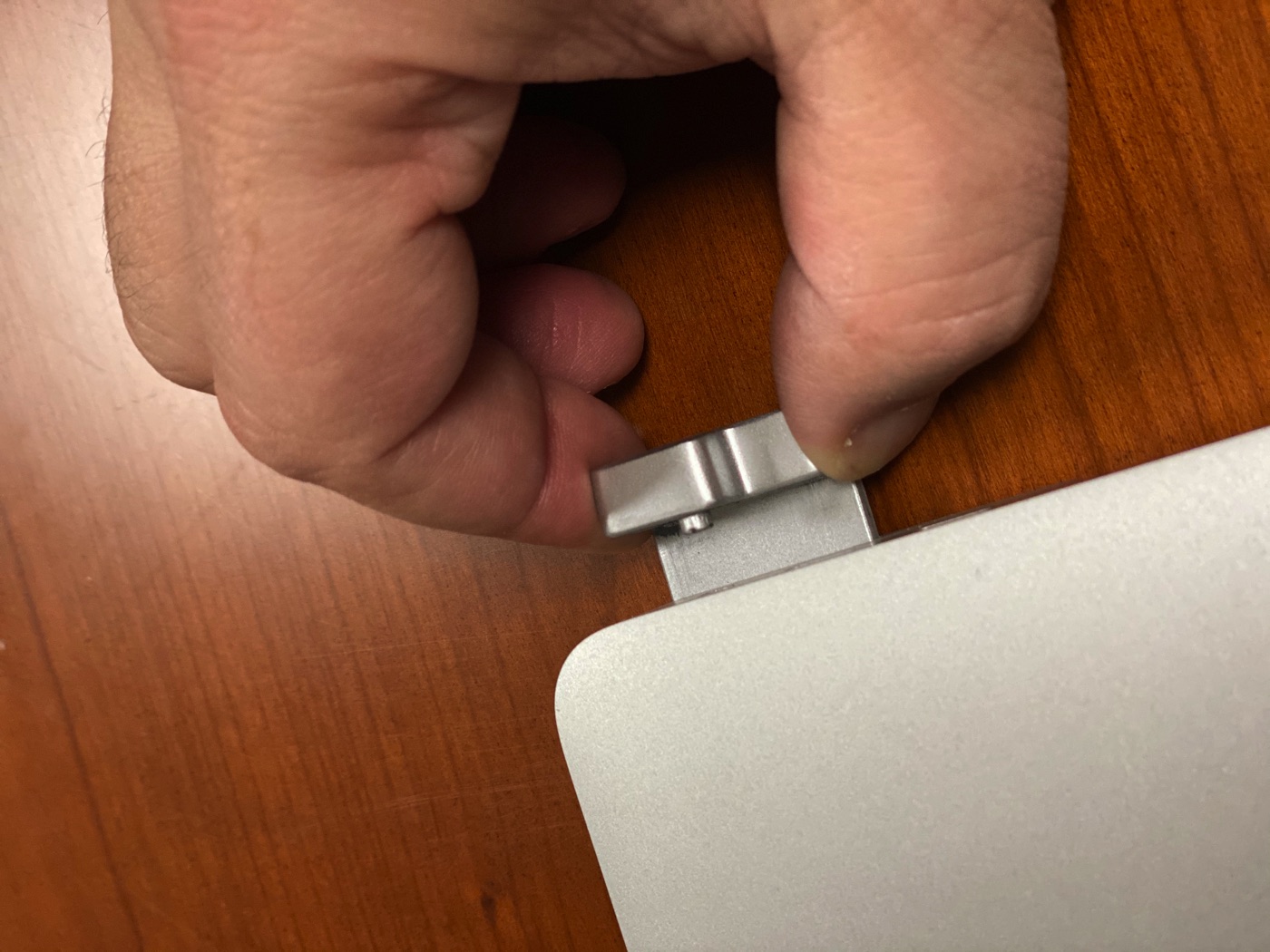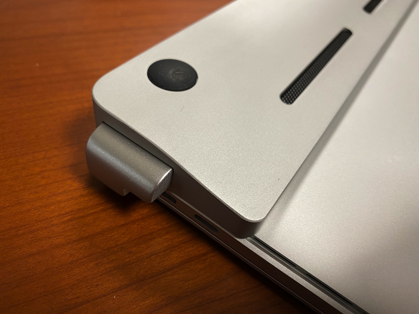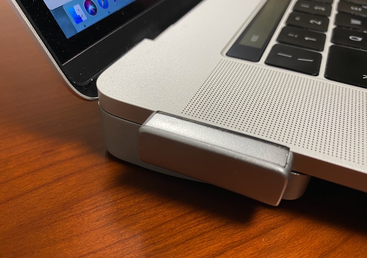 Una volta “incastrato” l’invisible hub funziona anche come rialzo per la parte posteriore e, come vedete dalle foto l’allineamanto con il nostro MacBook da 15” è praticamente perfetto.