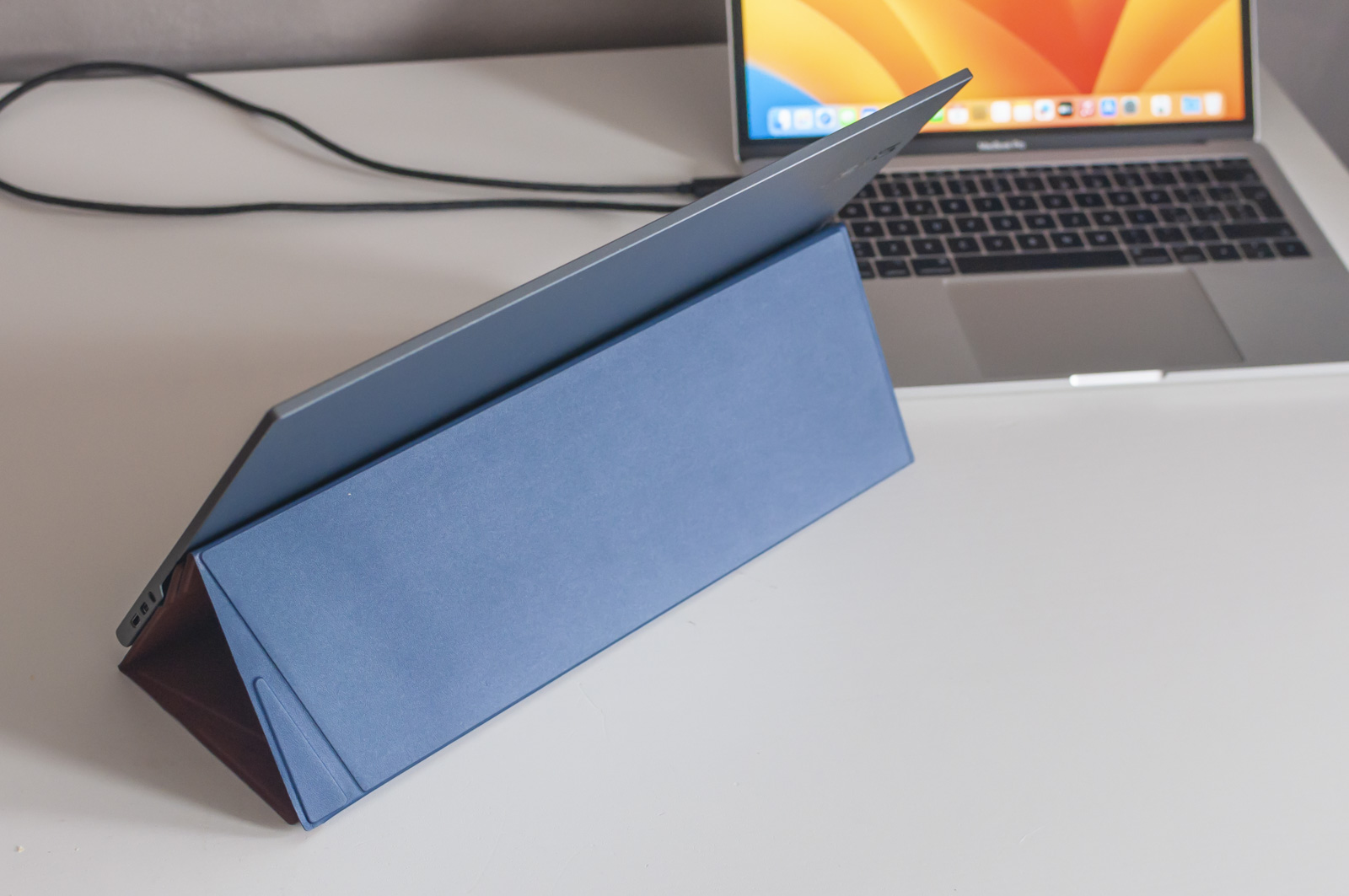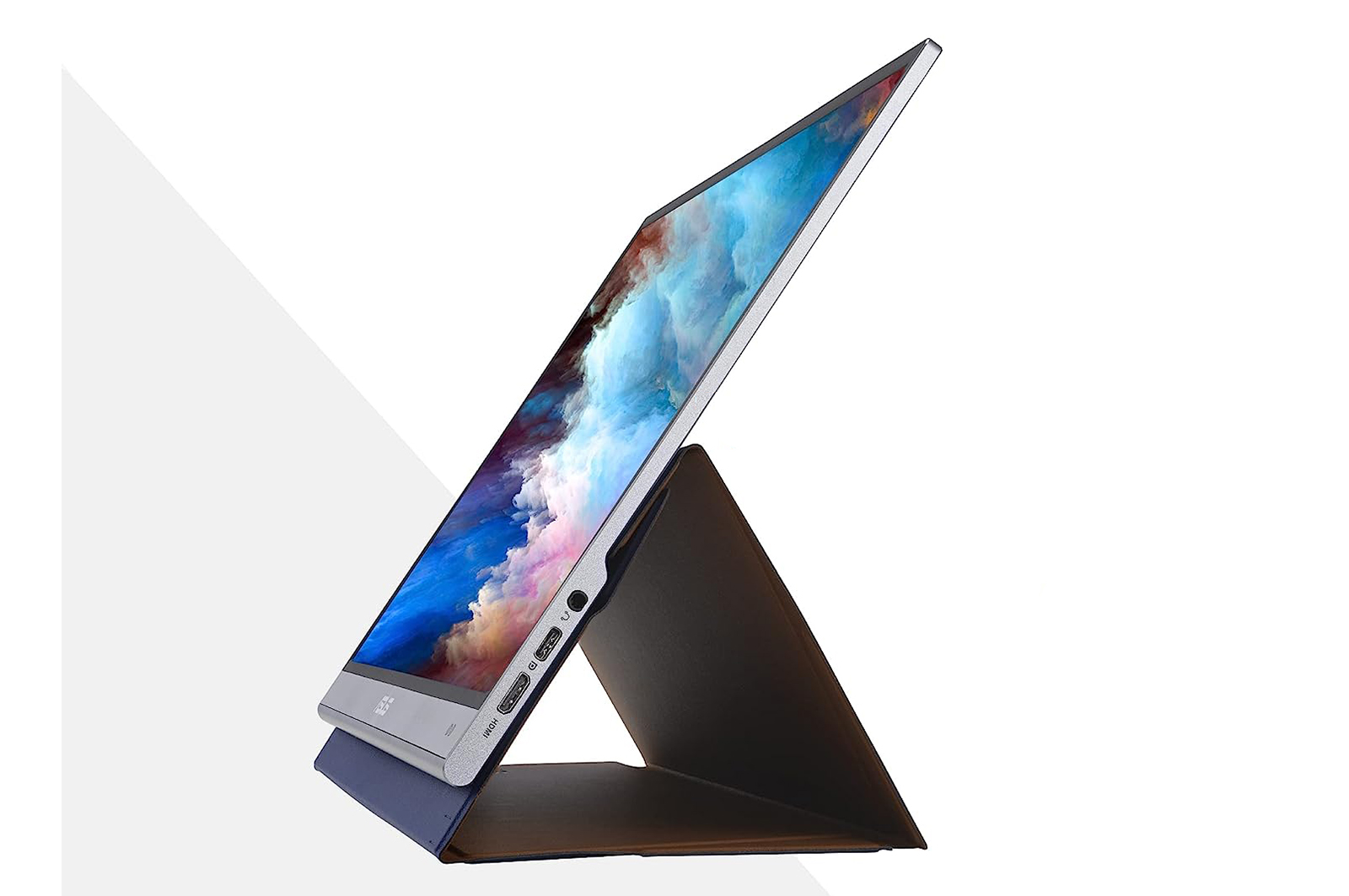 Ad accompagnare il monitor ci sono un cavo USB-C intrecciato, un cavo HDMI, una copertura in similpelle che fa anche da stand, l’alimentatore esterno, un adattatore USB-C/USB-A e quattro piedini in schiuma nera per i quali non abbiamo capito l’utilizzo se non quello in scatola.