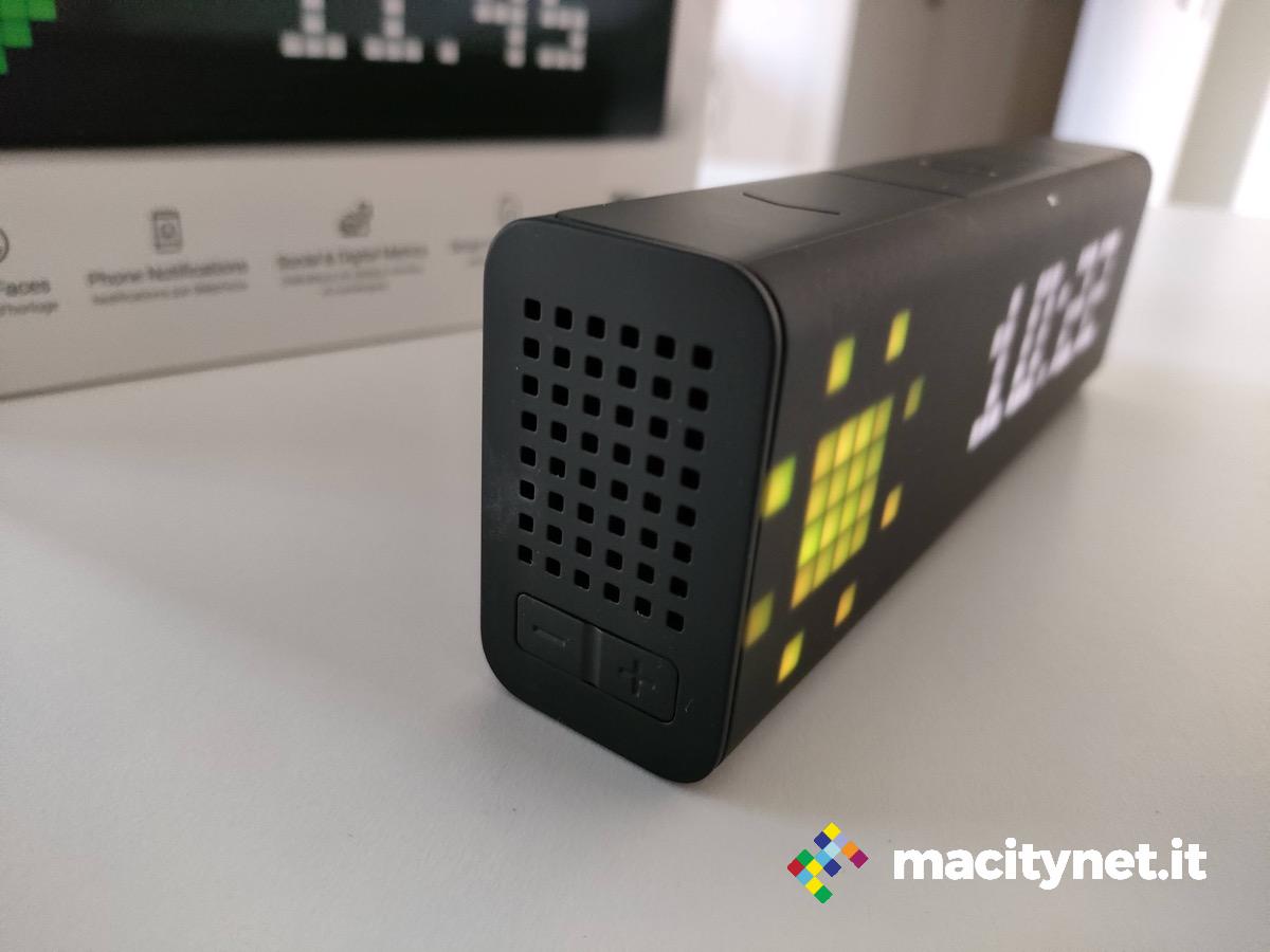 Si tratta di un piccolo rettangolo in plastica nera, con tre grossi pulsanti sulla fascia superiore, e con un particolare display su tutta la faccia frontale. Già un display animato da grossi pixel, che si alternano su tutta la superficie, per fornire innumerevoli informazioni all’utente. Sui due lati, invece, sono posizionati i tasti volume e quello per l’accensione spegnimento.