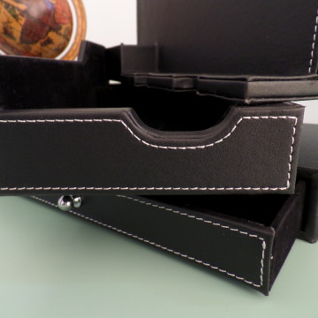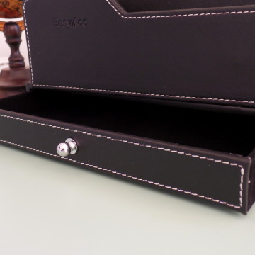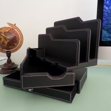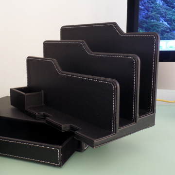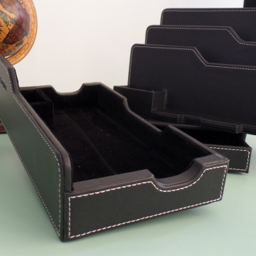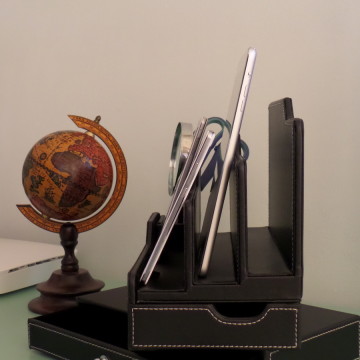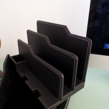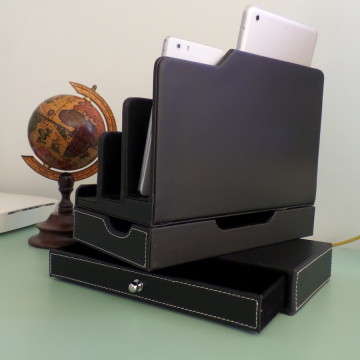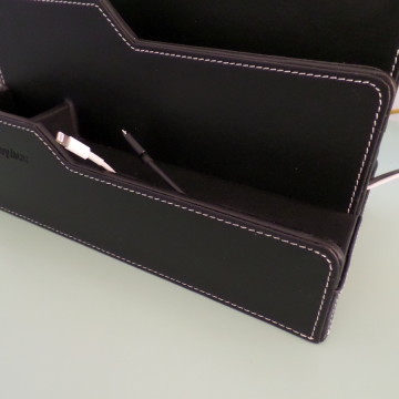 Realizzata in simil pelle colore nero, con uno stile classico, è ben fatta, quasi elegante, con diversi spazi e composta da diverse sezioni, che possono essere separate. Partendo dal basso, un piccolo cassettino con magnete si attacca alle altre componenti, ed è utile per riporre i cavi che solitamente si usano per ricaricare i vari dispositivi. Una seconda parte, quella mediana, consente di far passare i fili quando i device sono in ricarica, ma consente anche di ospitare altri oggetti, come ad esempio batterie, in modo da non necessitare prese di corrente per alimentare smartphone e tablet alloggiati sulla dock.
