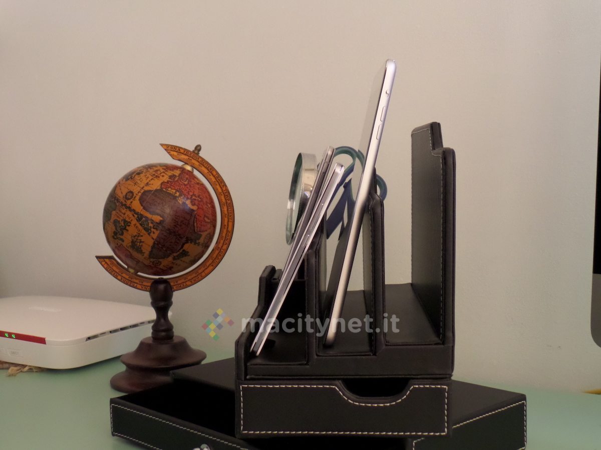 La parte superiore, invece, è quella in cui troveranno spazio iPad, iPhone o smartphone e tablet Android. Sono tre le nicchie n cui è possibile inserire i dispositivi. Il primo presenta anche due fori in cui far passare i cavi di ricarica, mentre quello in mezzo più profondo è tendenzialmente riservato a tablet e iPad, certamente più grandi dei vari smartphone. Ovviamente è possibile riporre sulla dock oggetti vari, come penne, forbici e tutti i vari accessori di cancelleria, che solitamente ingombrano la scrivania