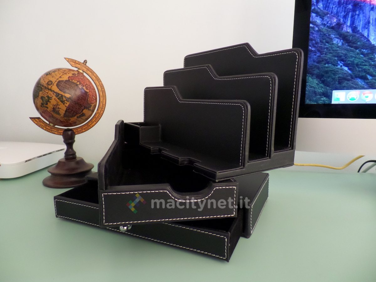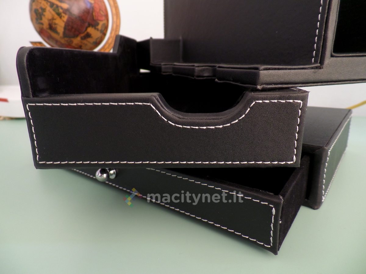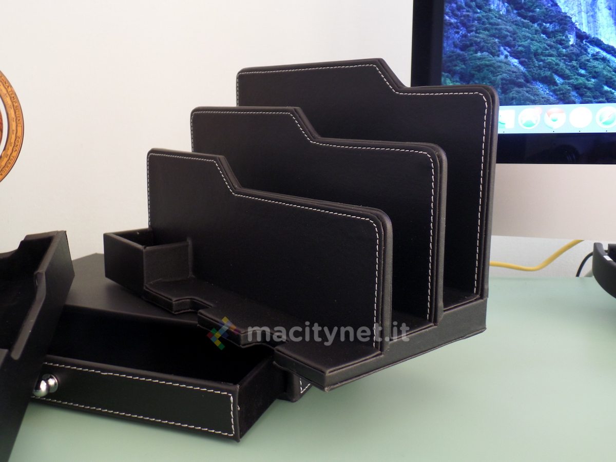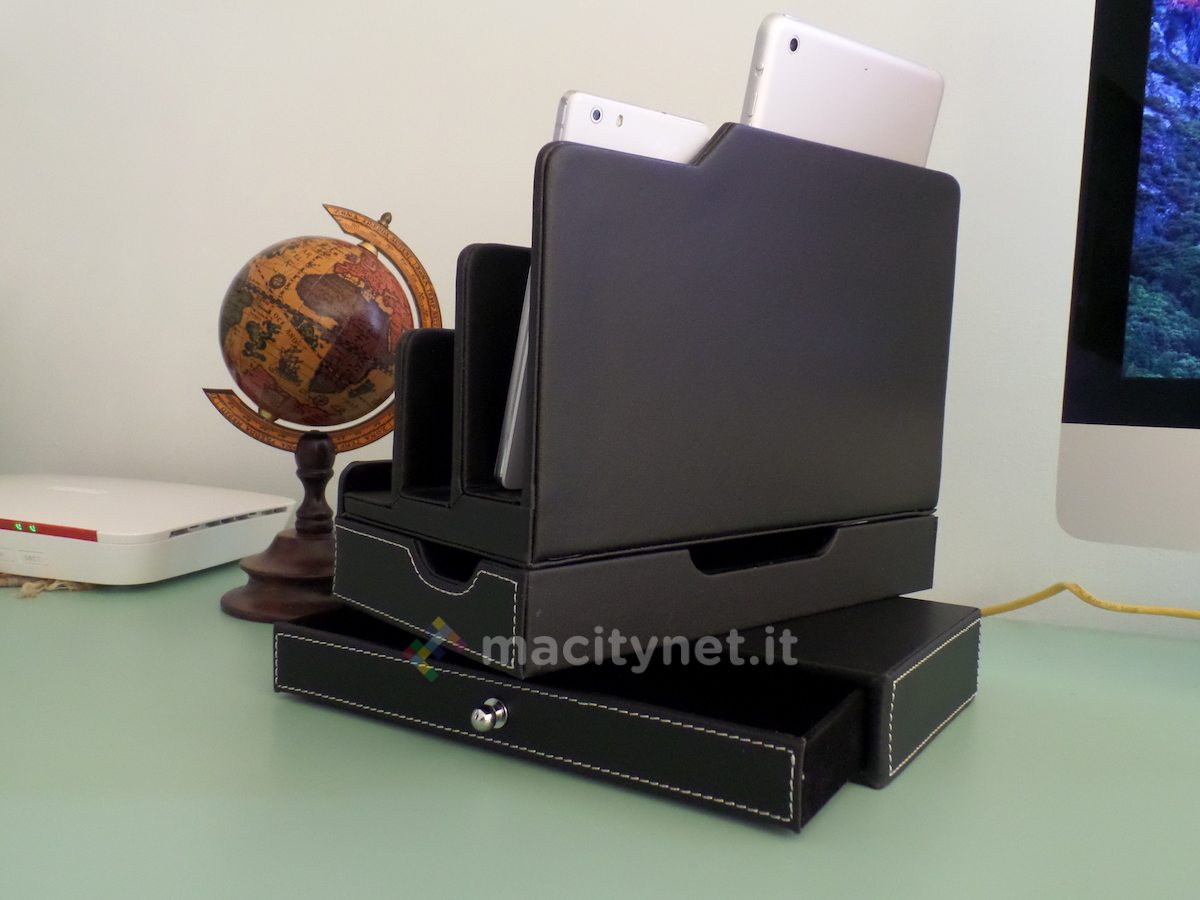 Realizzata in simil pelle colore nero, con uno stile classico, è ben fatta, quasi elegante, con diversi spazi e composta da diverse sezioni, che possono essere separate. Partendo dal basso, un piccolo cassettino con magnete si attacca alle altre componenti, ed è utile per riporre i cavi che solitamente si usano per ricaricare i vari dispositivi. Una seconda parte, quella mediana, consente di far passare i fili quando i device sono in ricarica, ma consente anche di ospitare altri oggetti, come ad esempio batterie, in modo da non necessitare prese di corrente per alimentare smartphone e tablet alloggiati sulla dock.