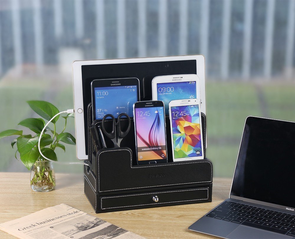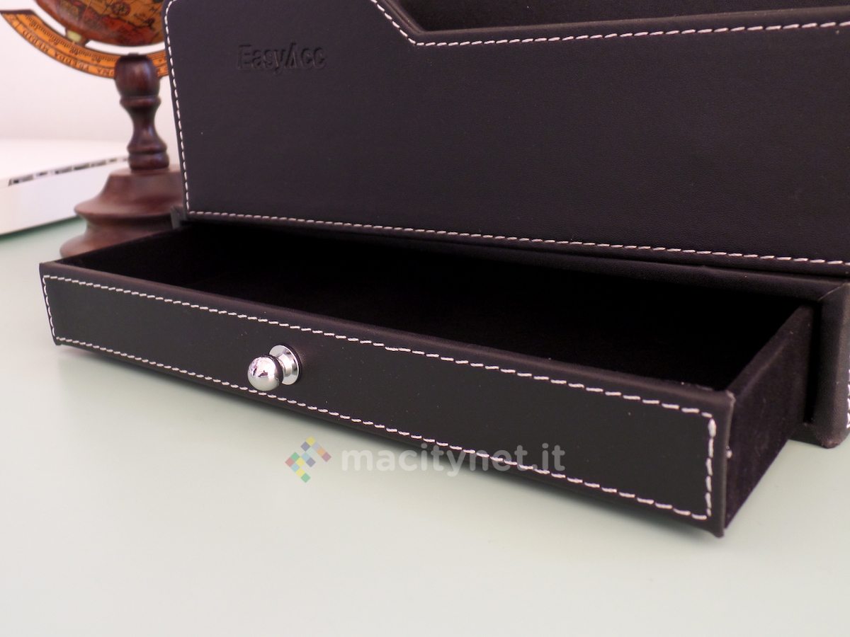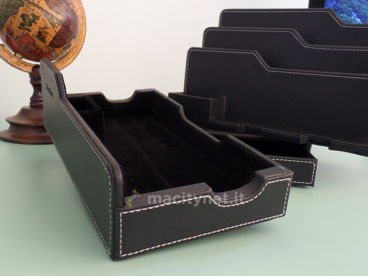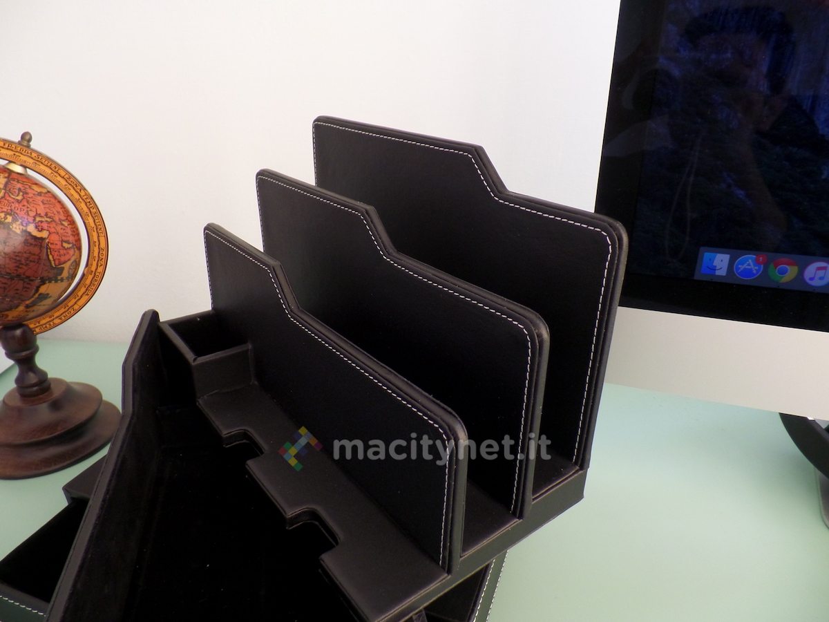 Realizzata in simil pelle colore nero, con uno stile classico, è ben fatta, quasi elegante, con diversi spazi e composta da diverse sezioni, che possono essere separate. Partendo dal basso, un piccolo cassettino con magnete si attacca alle altre componenti, ed è utile per riporre i cavi che solitamente si usano per ricaricare i vari dispositivi. Una seconda parte, quella mediana, consente di far passare i fili quando i device sono in ricarica, ma consente anche di ospitare altri oggetti, come ad esempio batterie, in modo da non necessitare prese di corrente per alimentare smartphone e tablet alloggiati sulla dock.