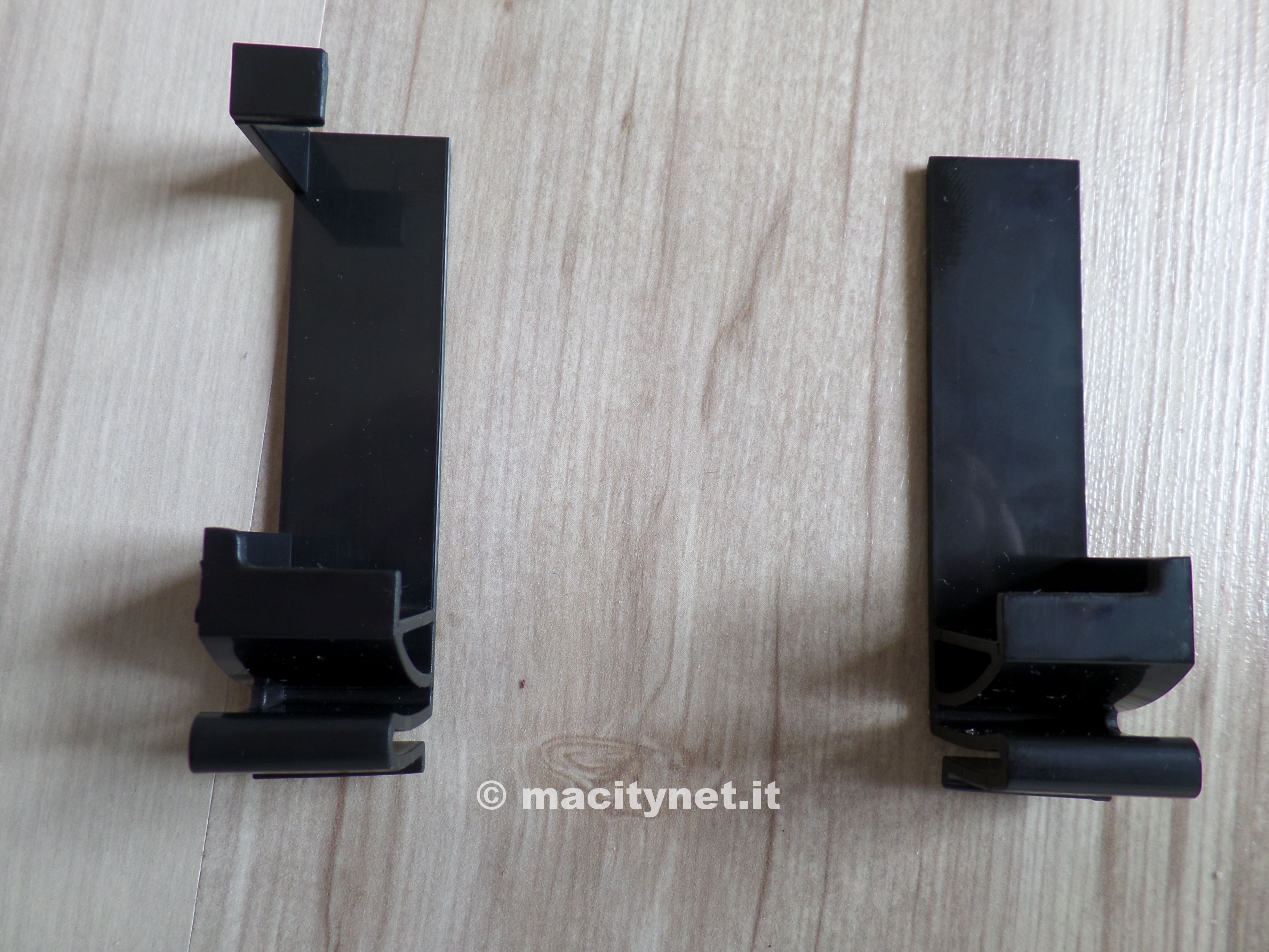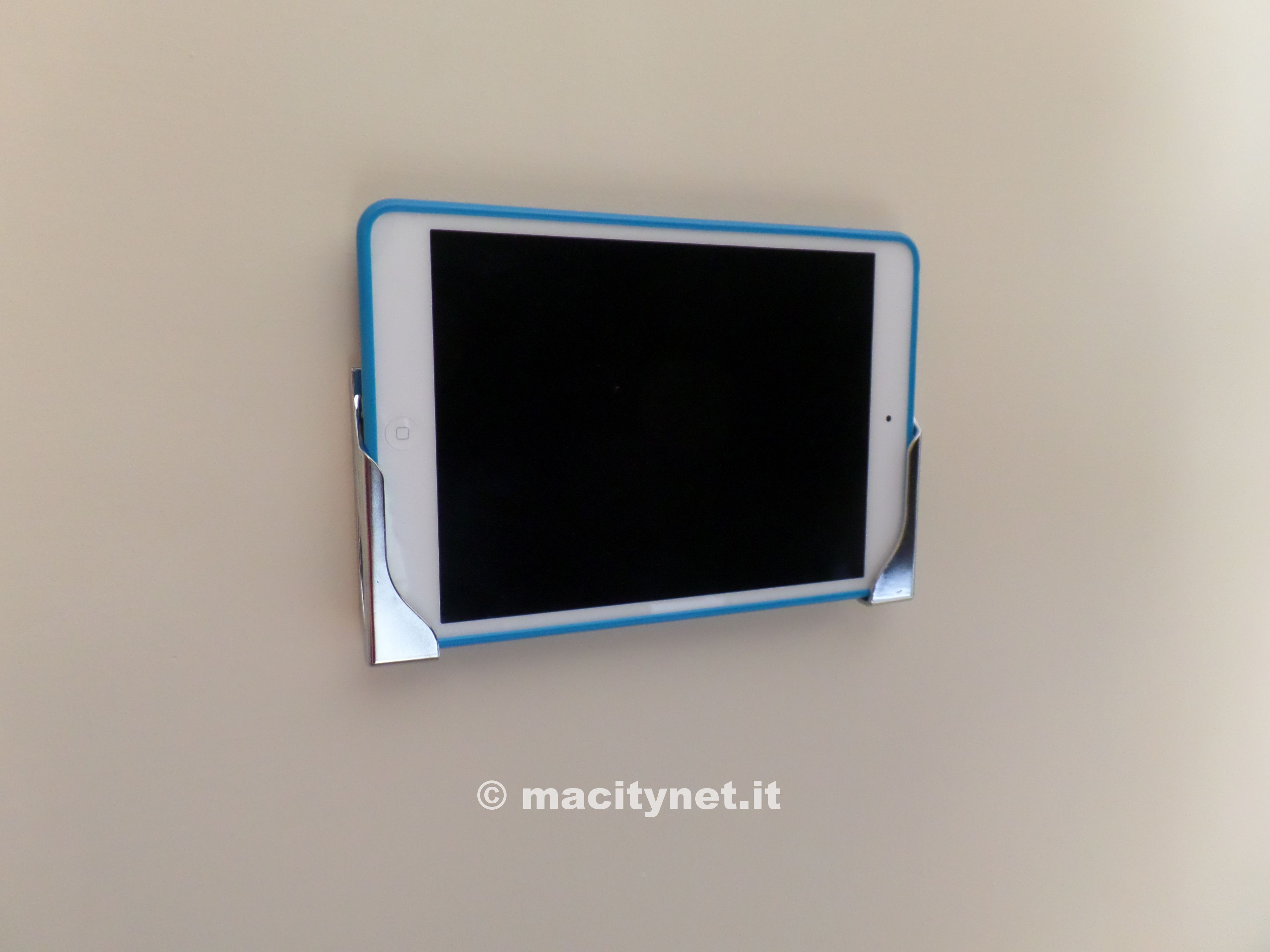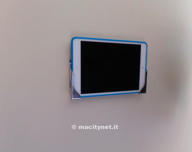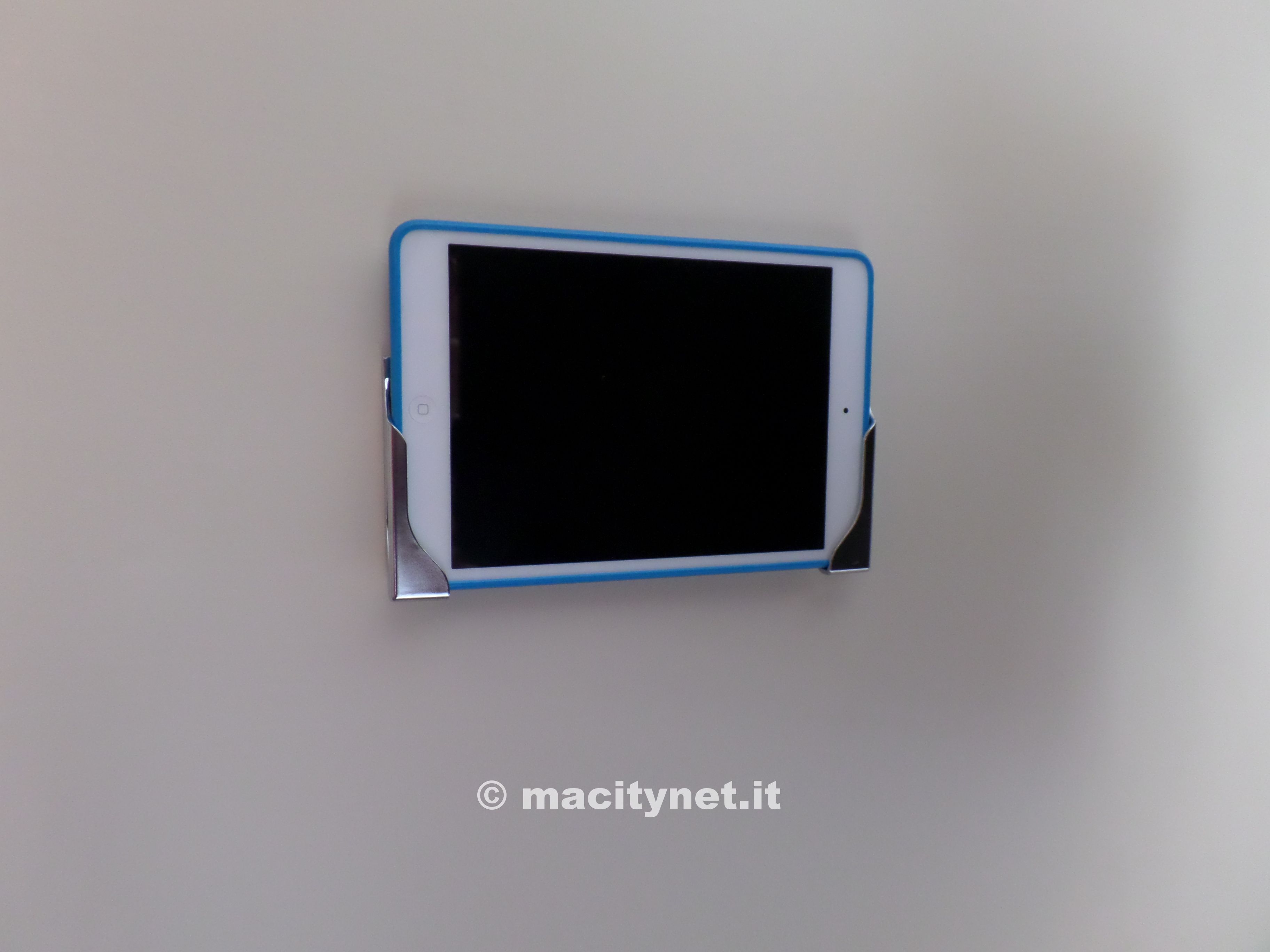 Koala Mount è, probabilmente, il dock più adatto per iPad e tablet di grosse dimensioni, dato che i due ganci di cui è composto formano quasi un binario all’interno del quale inserire il proprio dispositivo. I ganci sono costruiti in plastica e, seppur leggera e all’apparenza fragile, assicura una salda presa del dispositivo. Lo spessore dei ganci permette di accogliere anche iPad dotati di cover ingombrantii, comprese le smart cover di Apple. Questa caratteristica permette di agganciare iPad al muro senza la preoccupazione di spogliarlo, di volta in volta, delle protezioni. Le parti esterne dei due ganci sono traforate, così da poter raggiungere facilmente il tasto di accensione dei dispositivi e, più in generale, tutti i tasti che sui tablet vengono posizionati sulle cornici superiori. Infatti, posizionando il dispositvo in orizzontale, i pulsanti e gli ingressi che si trovano sulla cornice in alto o in basso, verrano a trovarsi in corrispondenza con i fori presenti nei due ganci. Ovviamente, non trattandosi di dock appositamente studiati per i dispositivi iOS è impossibile aspettarci che i fori del dock combacino perfettamente. Ad esempio, con iPad Mini si fatica un po’ ad inserire il connettore lightning, mentre con un iPad full size non si ha alcun tipo di problema.