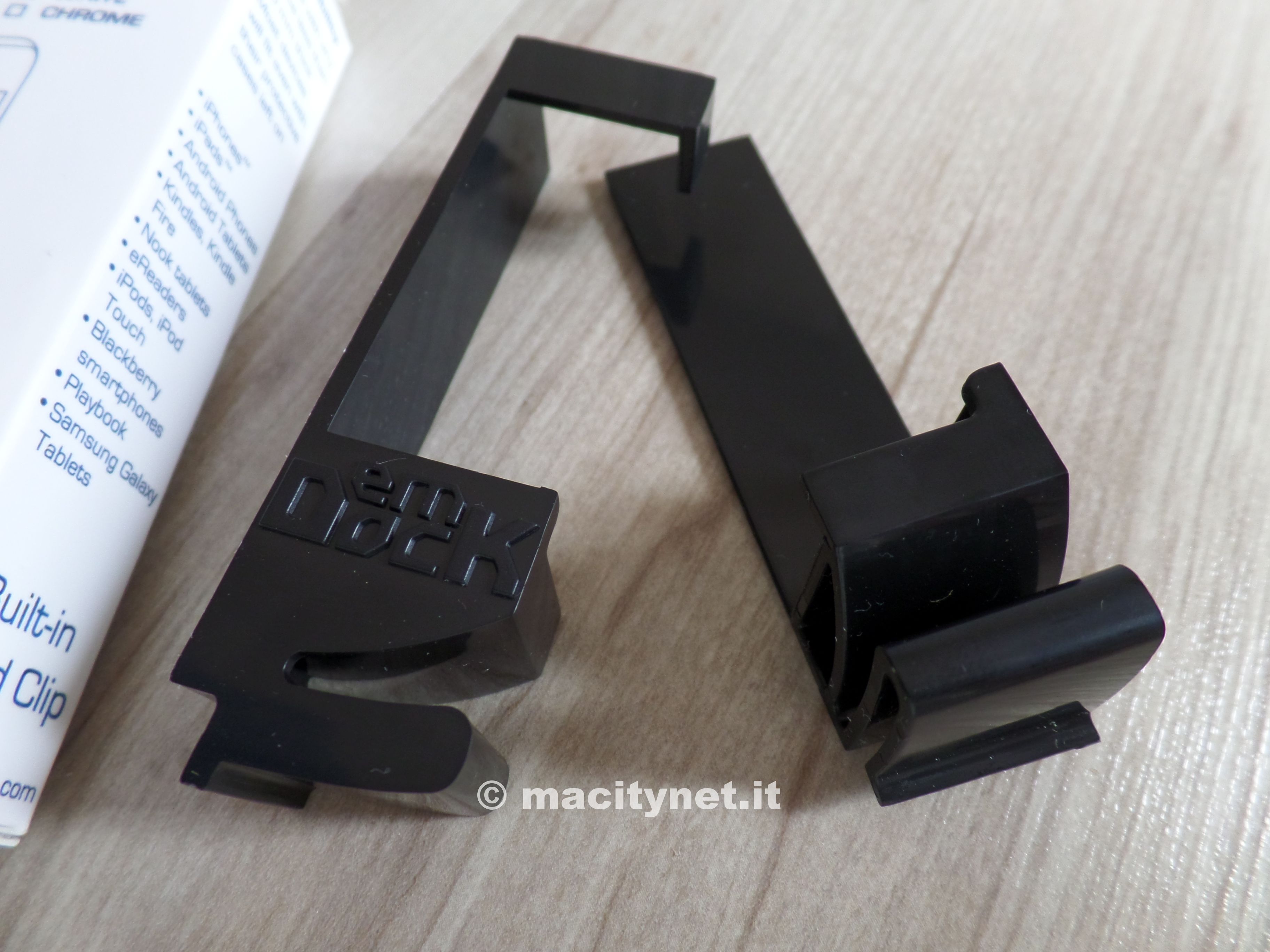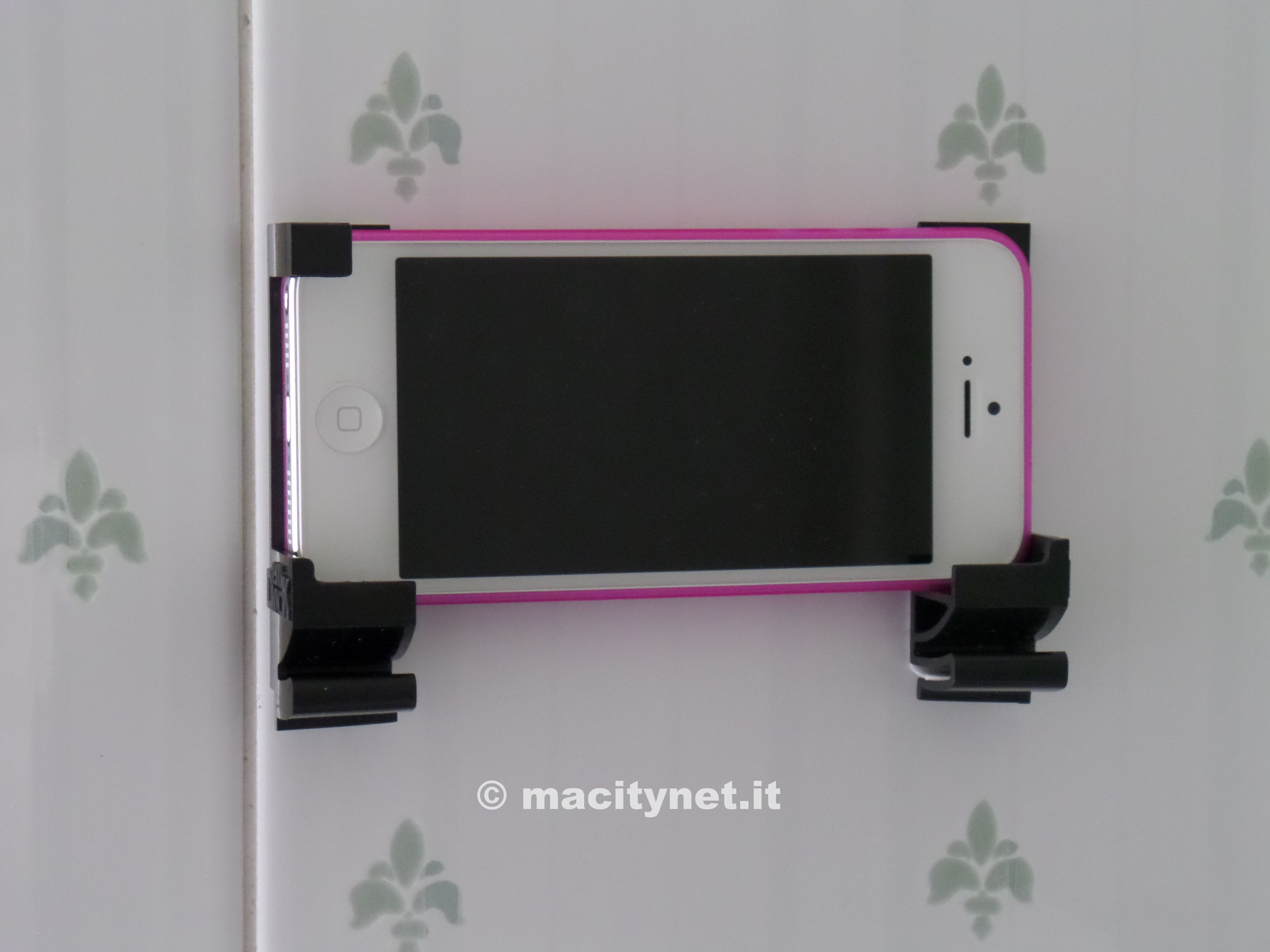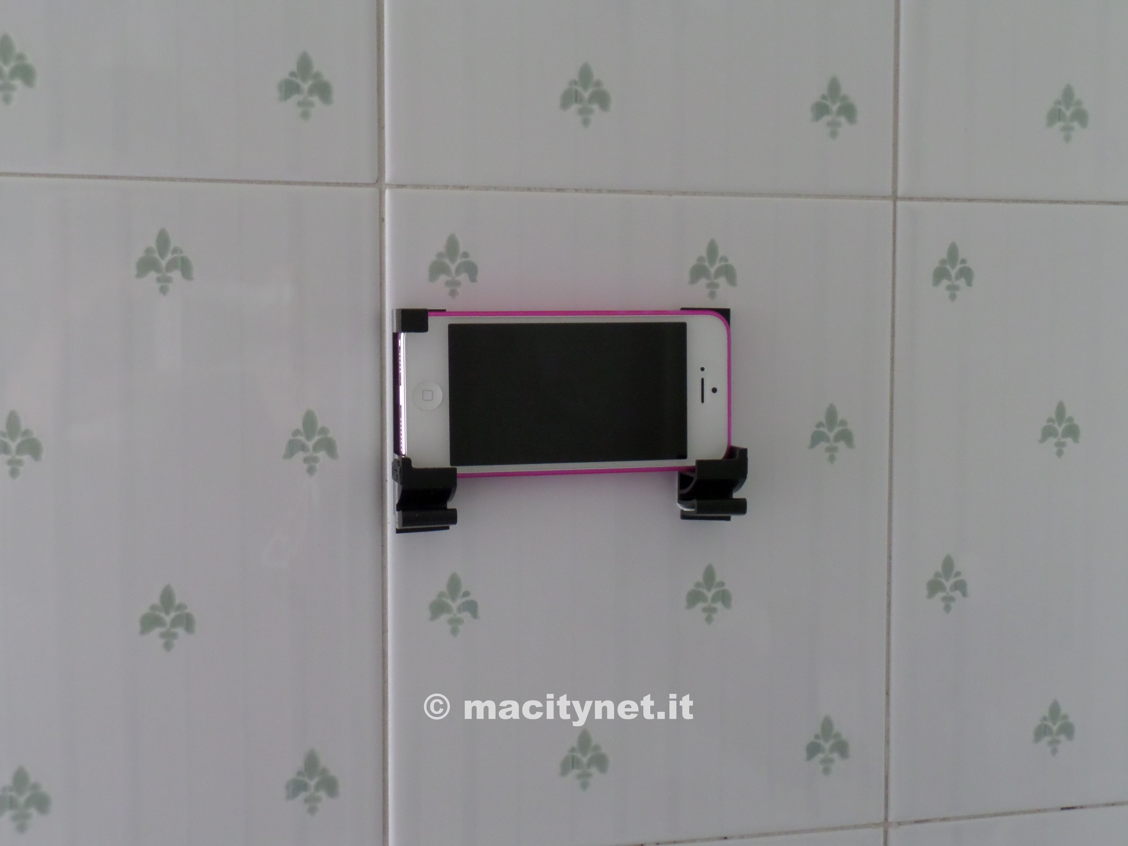 Il supporto Dockem, che comunque viene distribuito come dock universale per smartphone e tablet, è probabilmente più adatto ai dispositivi di piccole dimensioni. A differenza di Koala Mount i due ganci non presentano alcun binario all’interno del quale far scivolare il dispositivo, che verrà assicurato soltanto da una piccola protuberanza, oltre che dai due rialzi presenti sulla parte bassa dei due ganci. Anche se il Dockem potrebbe risultare in alcuni casi più adatto ad un terminale più leggero, per via del binario invece presente nel Koala Mount, tra i due prodotti in prova è risultato quello più versatile. Infatti, proprio l’assenza di un più rigido binario consente di ospitare qualsiasi dispositivo con spessore non superiore ai 2 cm. Inoltre, questo Dockem è ancor più minimale di Koala Mount, anche se entrambi i supporti risultano essere particolarmente semplici, tanto da non rovinare assolutamente l’estetica di qualsiasi ambiente. Non sono certamente invisibili, ma risultano molto più discreti di qualsiasi altro supporto a ventosa o con staffe semoventi.