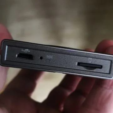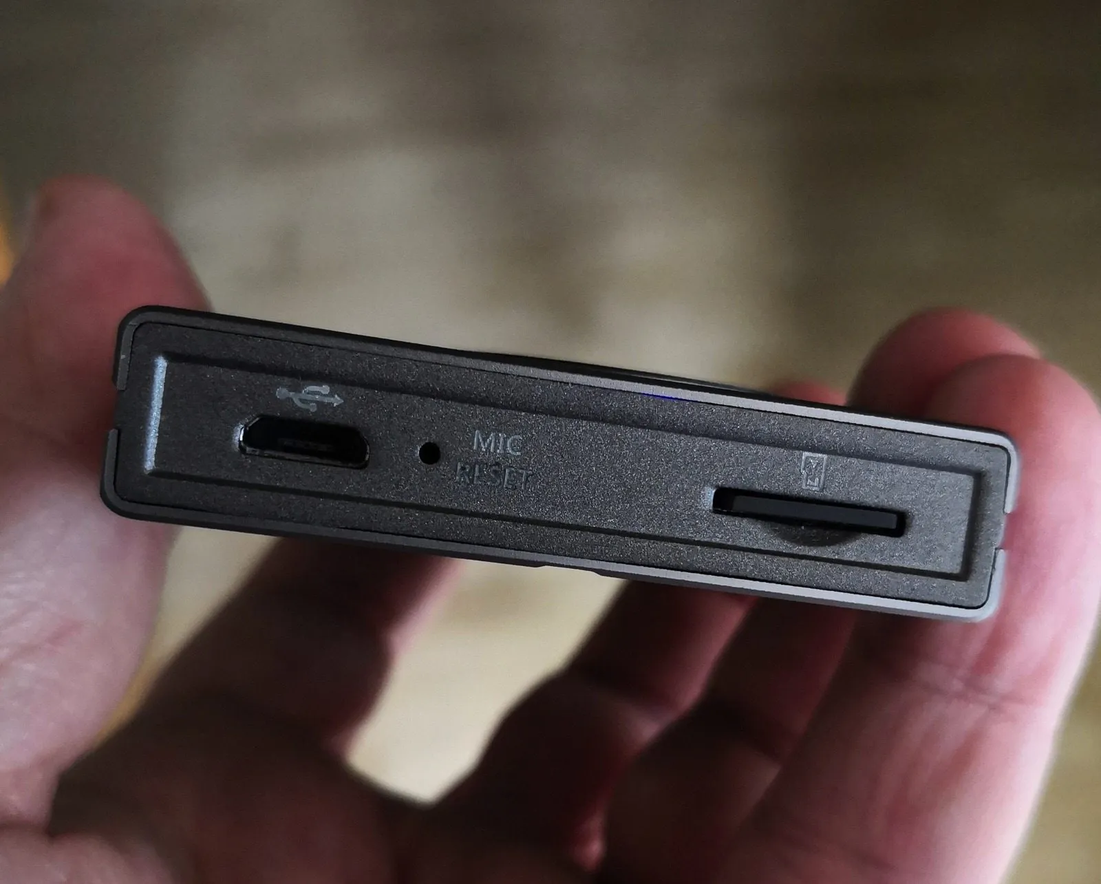 Le porte a bordo sono: 1 porta micro-USB per la ricarica e il trasferimento dati, uno slot per MicroSD card, una porta cuffia da 3.5 mm, 1 porta line out da 3.5 mm. Le dimensioni finali sono di 97 * 55 * 13 mm e il tutto pesa 108 grammi.