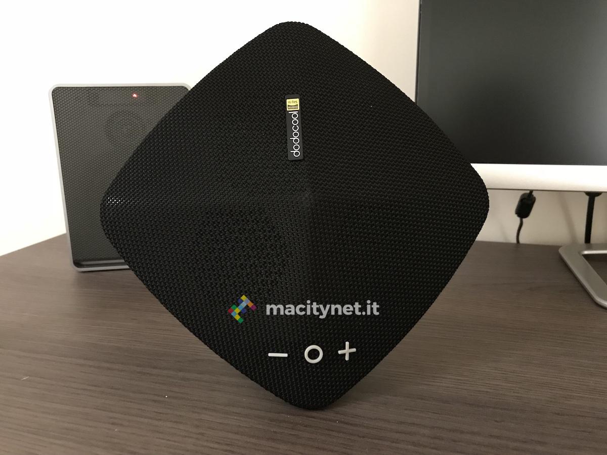 All’interno della confezione di Dodocool, oltre all’altoparlante, fornisce anche il cavo microUSB per la ricarica e un piccolo stand in plastica che permette all’altoparlante di “restare in piedi”. A livello estetico la periferica è abbastanza grande e ingombrante, e presenta una forma che, con buona fantasia, può paragonarsi ad un diamante. Sulla parte frontale svettano i tre pulsanti azioni, molto vistosi e rialzati, così da poter essere sempre raggiunti con la massima semplicità. Questi permettono di alzare, o abbassare, il volume, e di mettere in pausa, o riprendere, la riproduzione musicale.