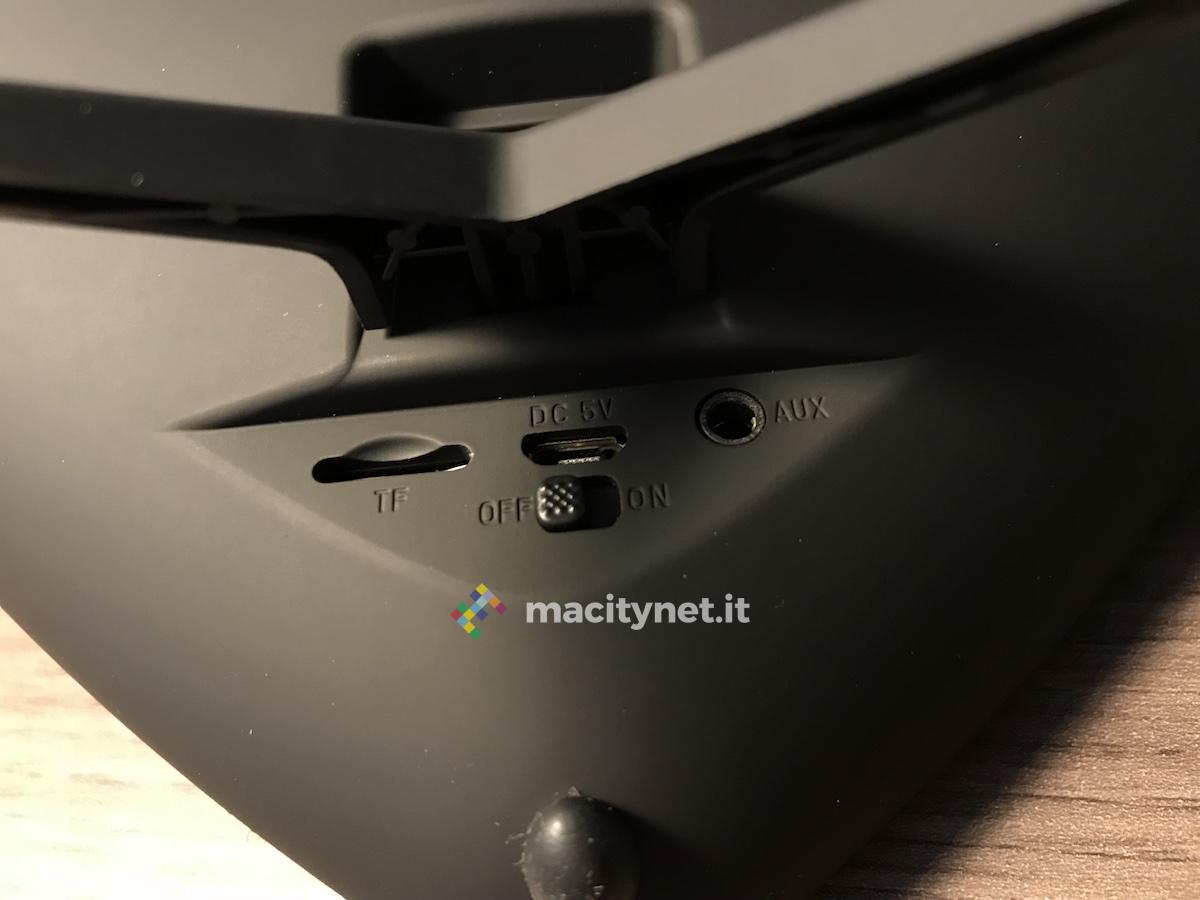 Sulla parte posteriore, invece, oltre al piccolo pulsante di accensione, sono disponibili anche ingressi vari. Non solo quello canonico del jack da 3,5mm, ma anche una USB Full size e un ingresso microSD. Questi permettono di ampliare le fonti dalle quali ascoltare musica. Non solo, dunque, sarà possibile collegare il proprio smartphone in bluetooth, ma si potranno ascoltare brani da una penna USB esterna o da una microSD.