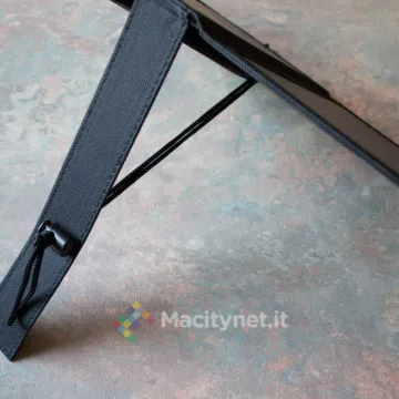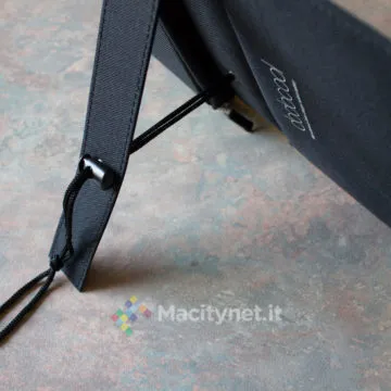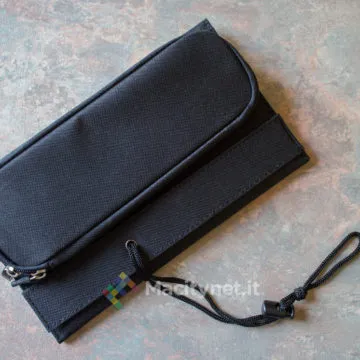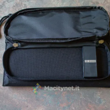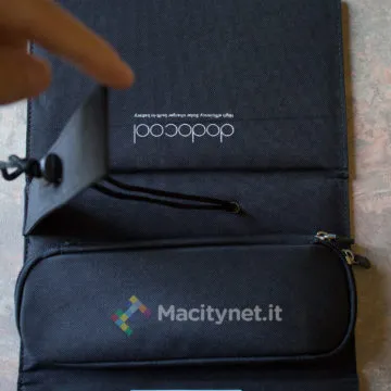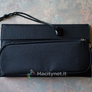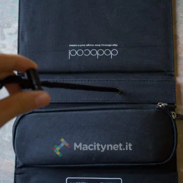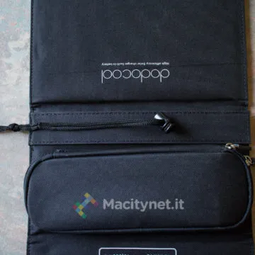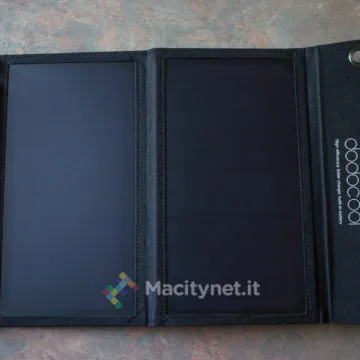 I pannelli solari di cui è dotato l’accessorio sono due, molto ampi (ciascuno di essi misura 24 x 12,5 centimetri) e ben protetti da un sistema “a borsetta”. Quando non sono in uso vengono infatti richiusi all’interno dell’astuccio al quale sono incorporati, grande 26,5 x 15,5 x 1,5 centimetri, e tenuti fermi da un sistema magnetico incorporato nell’asola.