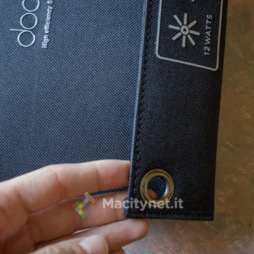 Quest’ultima, compresa la seconda, più piccola, ripiegata all’interno dell’accessorio quando chiuso, è dotata di due fori rinforzati da anelli in metallo che permettono di agganciare i pannelli solari, per mezzo di moschettoni o corde (non inclusi nella confezione) ad uno zaino, ad una tenda o nel punto che si ritiene più opportuno.