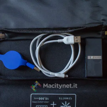 In un lato esterno trova posto una sorta di cavalletto, bloccato da un cordino che permette di regolarne l’inclinazione, potendo così direzionare con più facilità i due pannelli verso i raggi del sole. Vicino al cavalletto c’è una tasca, chiusa da una zip robusta, che protegge le due uscite USB ed offre spazio per poter eventualmente accogliere qualche cavo per la ricarica dei dispositivi, mantenendo così tutto in ordine e pronto all’uso.