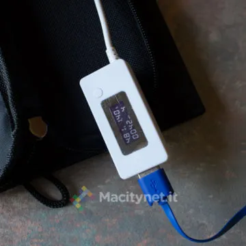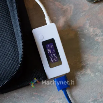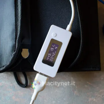 A quel punto abbiamo fatto prima qualche prova aiutandoci con un amperometro digitale per valutare l’effettiva potenza di uscita delle due prese USB. Collegando il nostro iPhone 6 Plus al 17% abbiamo potuto appurare che la presa lo ricaricava 1.4 A. Collegando un iPad mini 3 dall’altra uscita, anch’esso al 17%, le due prese hanno regolato la potenza di uscita, erogando 0.81 A per iPhone e 1.51 A per iPad, superando quindi i 2.1 A complessivi dichiarati dal produttore.