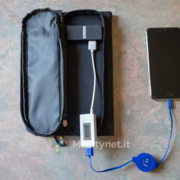La batteria incorporata arriva a casa già carica, così l’abbiamo prima fatta scaricare completamente ricaricando più volte i nostri dispositivi. A quel punto abbiamo esposto i pannelli in balcone in una giornata di luglio piuttosto soleggiata aiutandoci con il cavalletto per inclinarli perpendicolarmente ai raggi del sole.