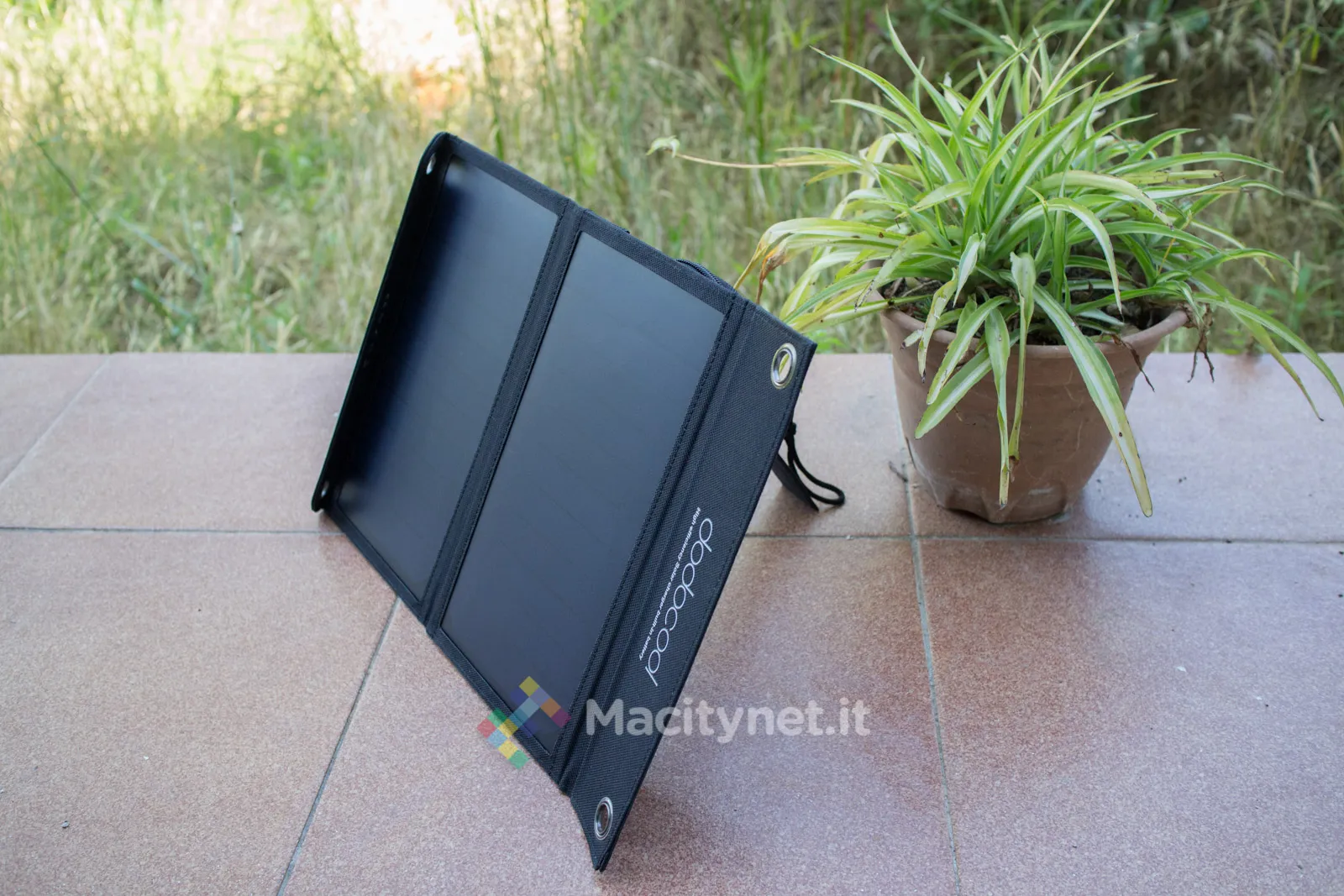 In un lato esterno trova posto una sorta di cavalletto, bloccato da un cordino che permette di regolarne l’inclinazione, potendo così direzionare con più facilità i due pannelli verso i raggi del sole. Vicino al cavalletto c’è una tasca, chiusa da una zip robusta, che protegge le due uscite USB ed offre spazio per poter eventualmente accogliere qualche cavo per la ricarica dei dispositivi, mantenendo così tutto in ordine e pronto all’uso.