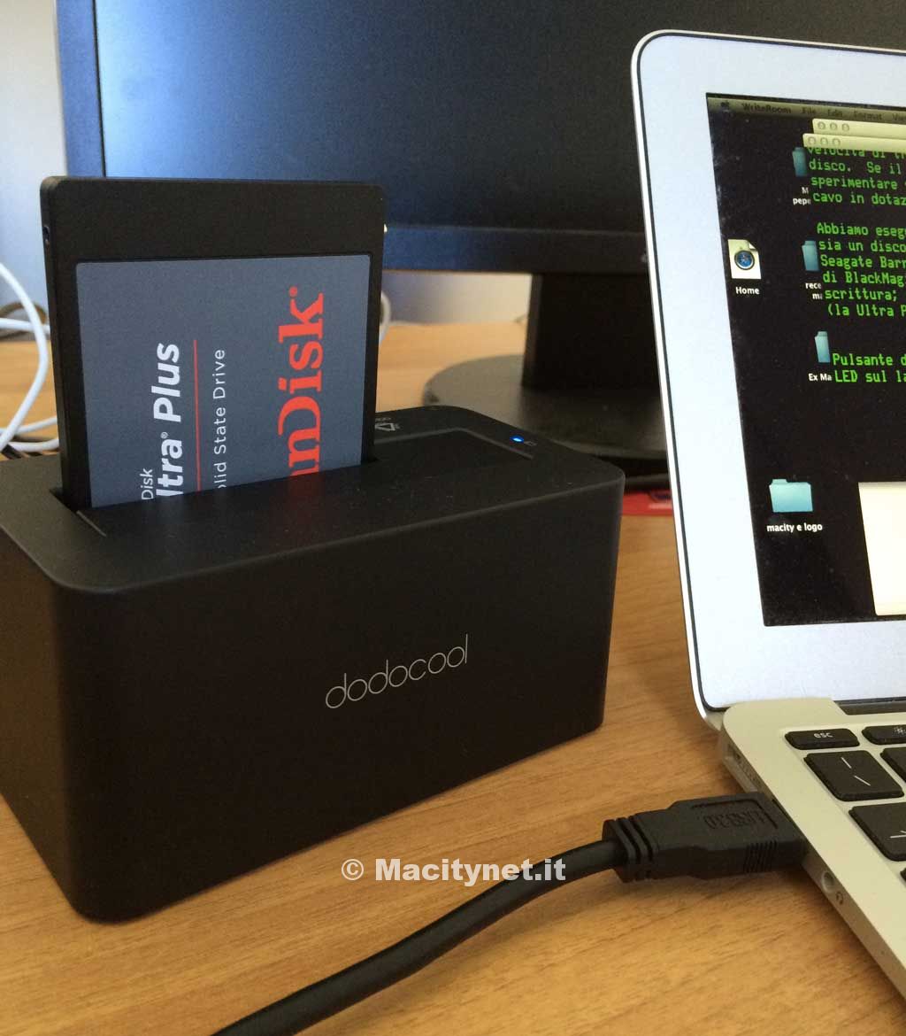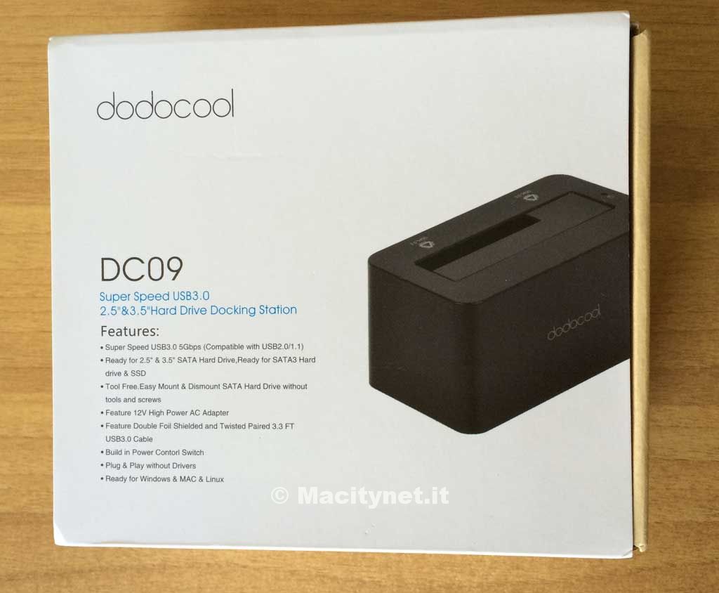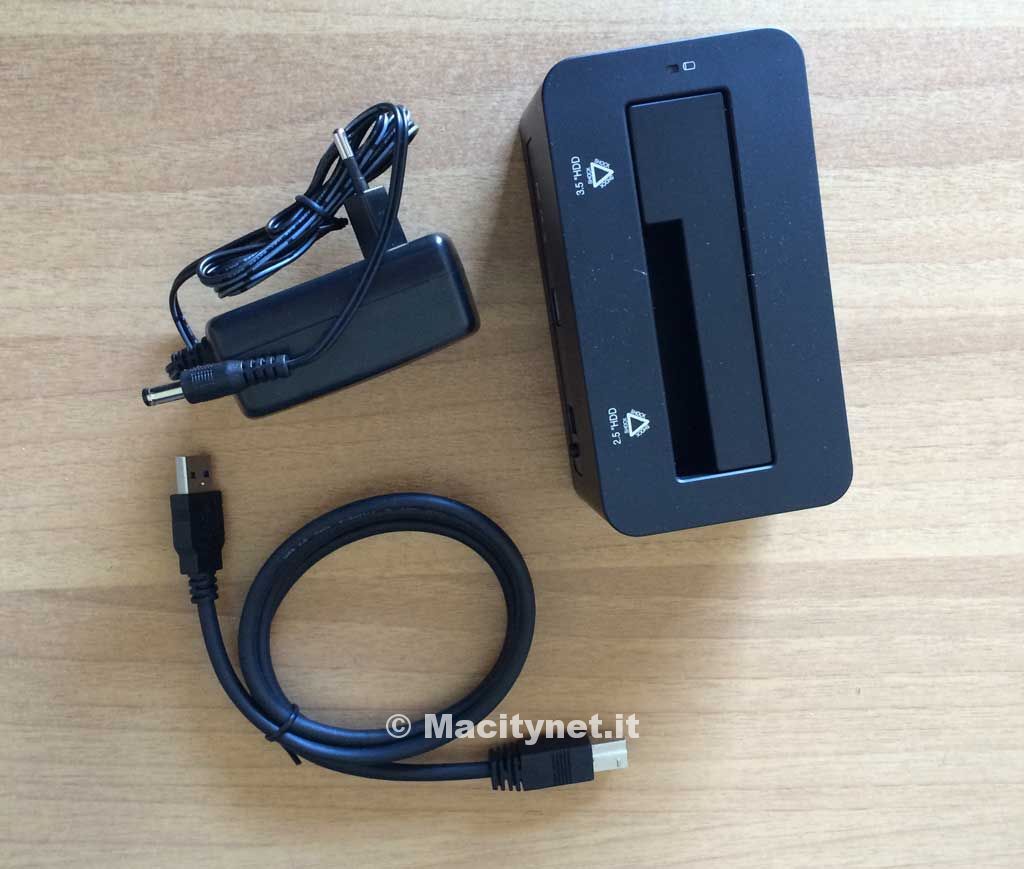 L’accessorio è in plastica ABS, è leggero (155 grammi) e di piccole dimensioni (132x72x65mm), comodo da tenere sulla scrivania vicino al computer (Mac o PC) da usare all’occorrenza. Si collega a una presa di corrente (nella confezione c’è un alimentatore da 12) e alla porta USB del computer e per iniziare non servono né driver né software: basta inserire un disco rigido (in verticale) al suo interno e questo diventa subito accessibile dal computer. Il DC09 supporta dischi rigidi SATA da 2,5″ e da 3,5″, comprese ovviamente le unità SSD. La velocità di trasferimento dipende sia dal computer utilizzato, sia dal disco. Se il computer è dotato di una porta USB 3.0 è possibile sperimentare velocità di trasferimento super veloci. Il dispositivo e il cavo in dotazione sono compatibili con la tecnologia USB 3.0 al 100%.