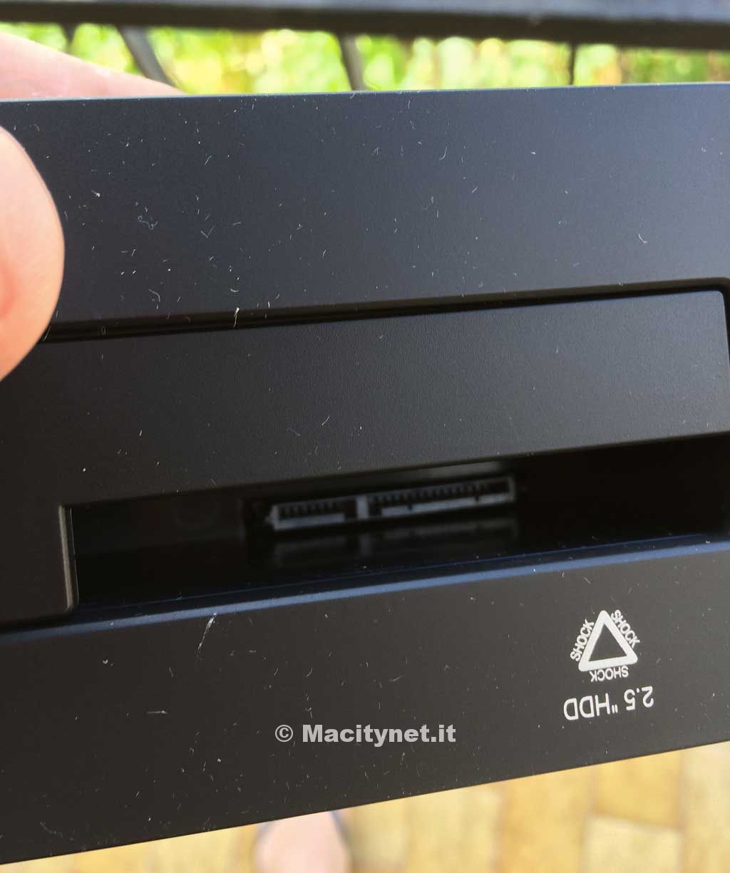 All’interno della confezione c’è un foglietto di carta con classiche indicazioni (in inglese) da seguire su Windows per espellere i dischi e creare partizioni. Sul retro dell’unità troviamo la porta USB, il connettore per l’alimentatore, il pulsante di accensione e spegnimento; un LED sulla parte superiore si accende e lampeggia in caso di accesso all’unità inserita nel dock.