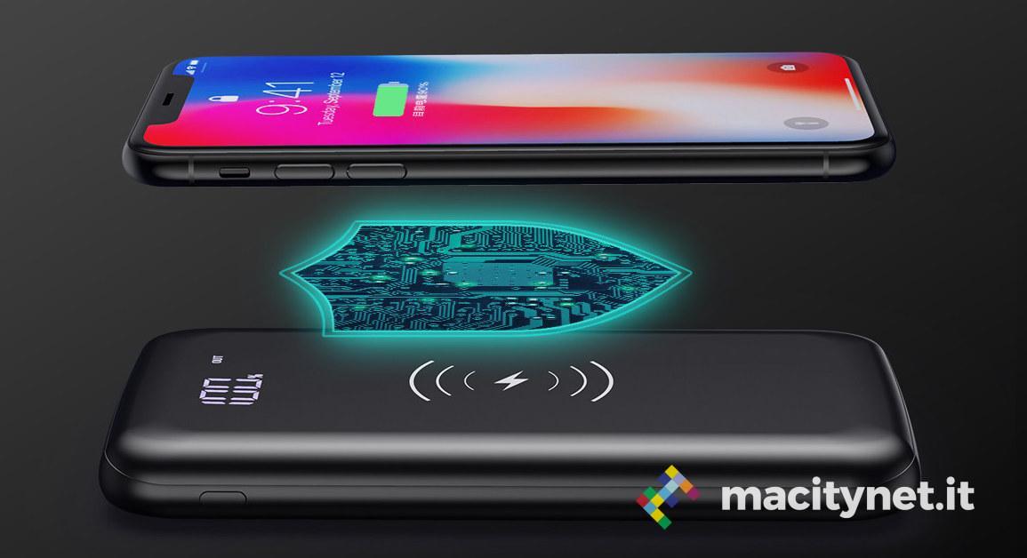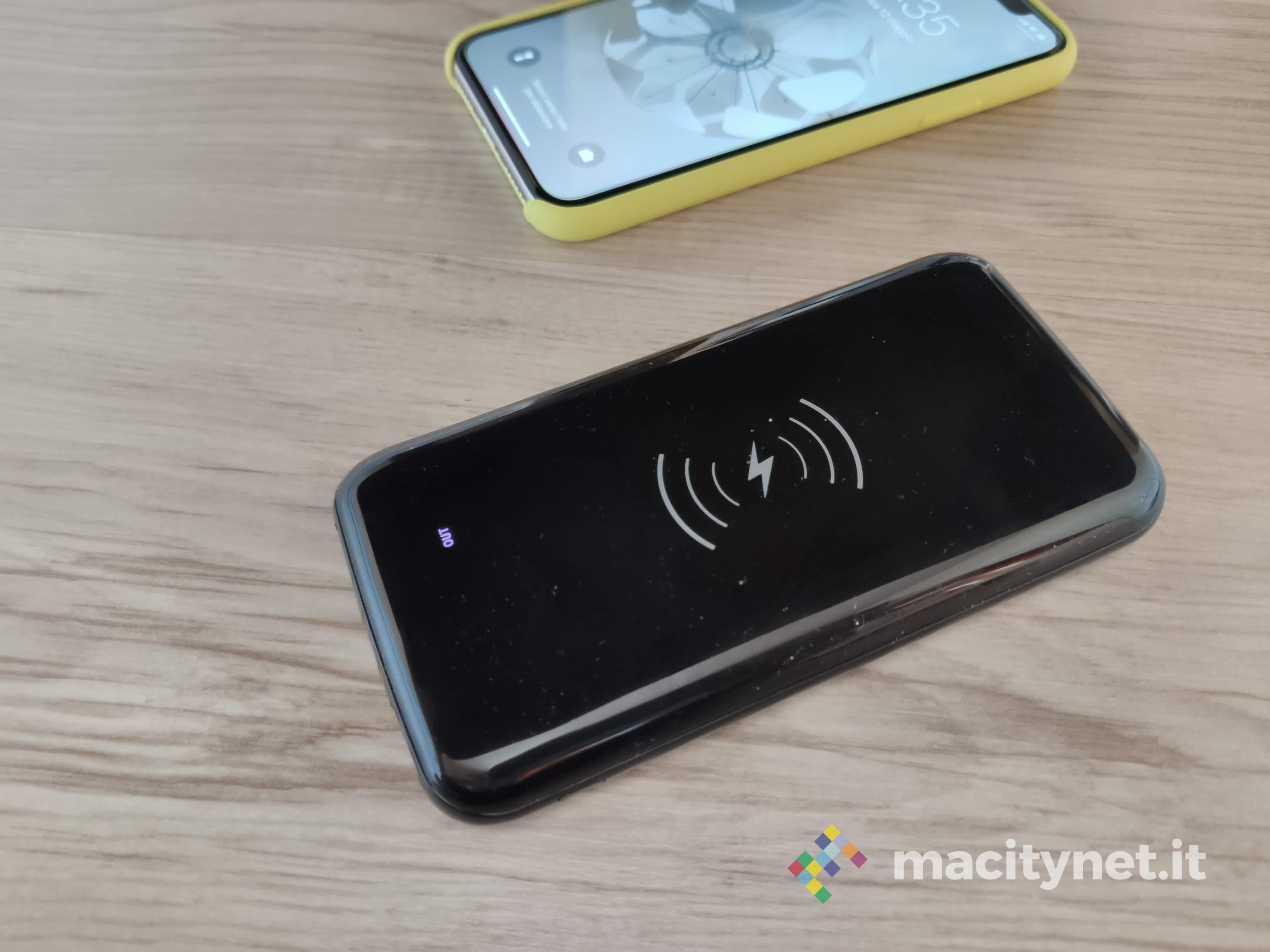 La particolarità della batteria, però, è ben visibile sulla parte superiore, lucida alla vista e sulla quale insiste un logo che fornisce subito l’indicazione di ricarica wireless. E infatti, è sufficiente adagiarvi sopra un dispositivo compatibile per avviare la ricarica wireless.