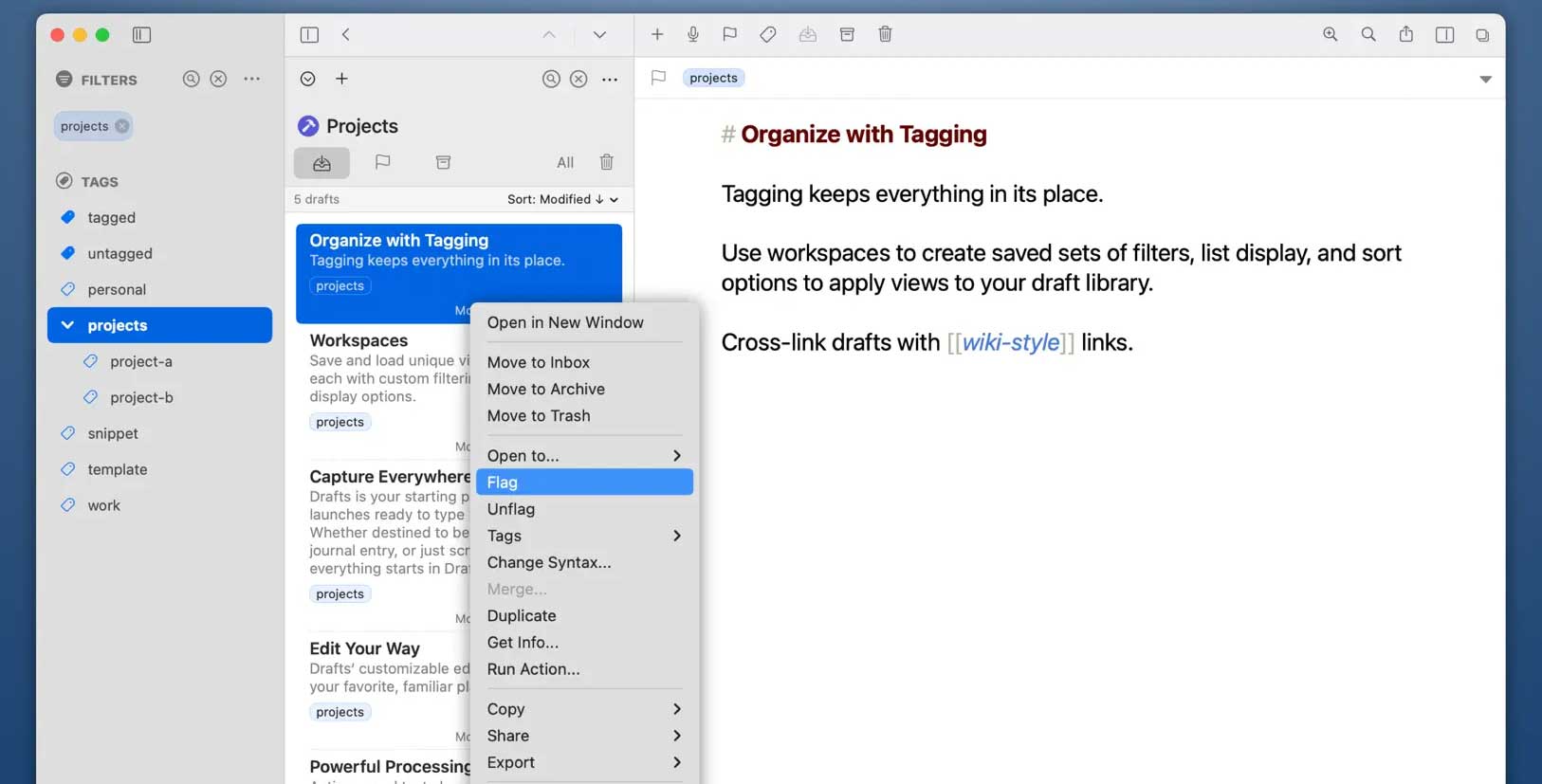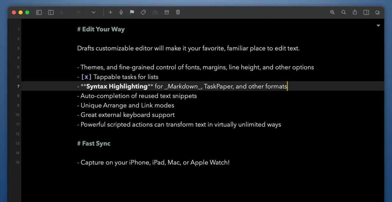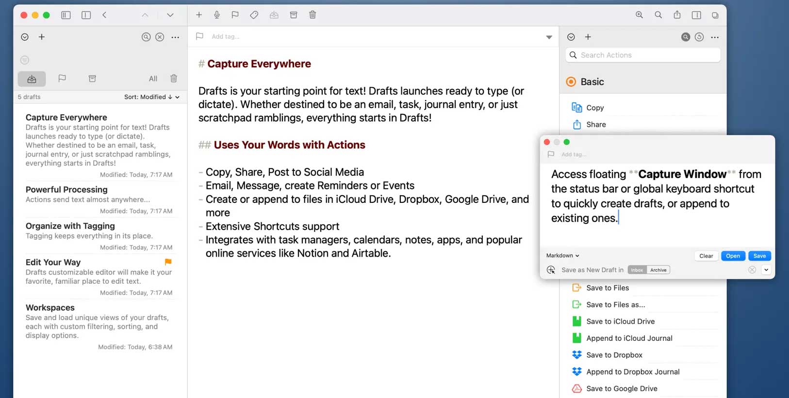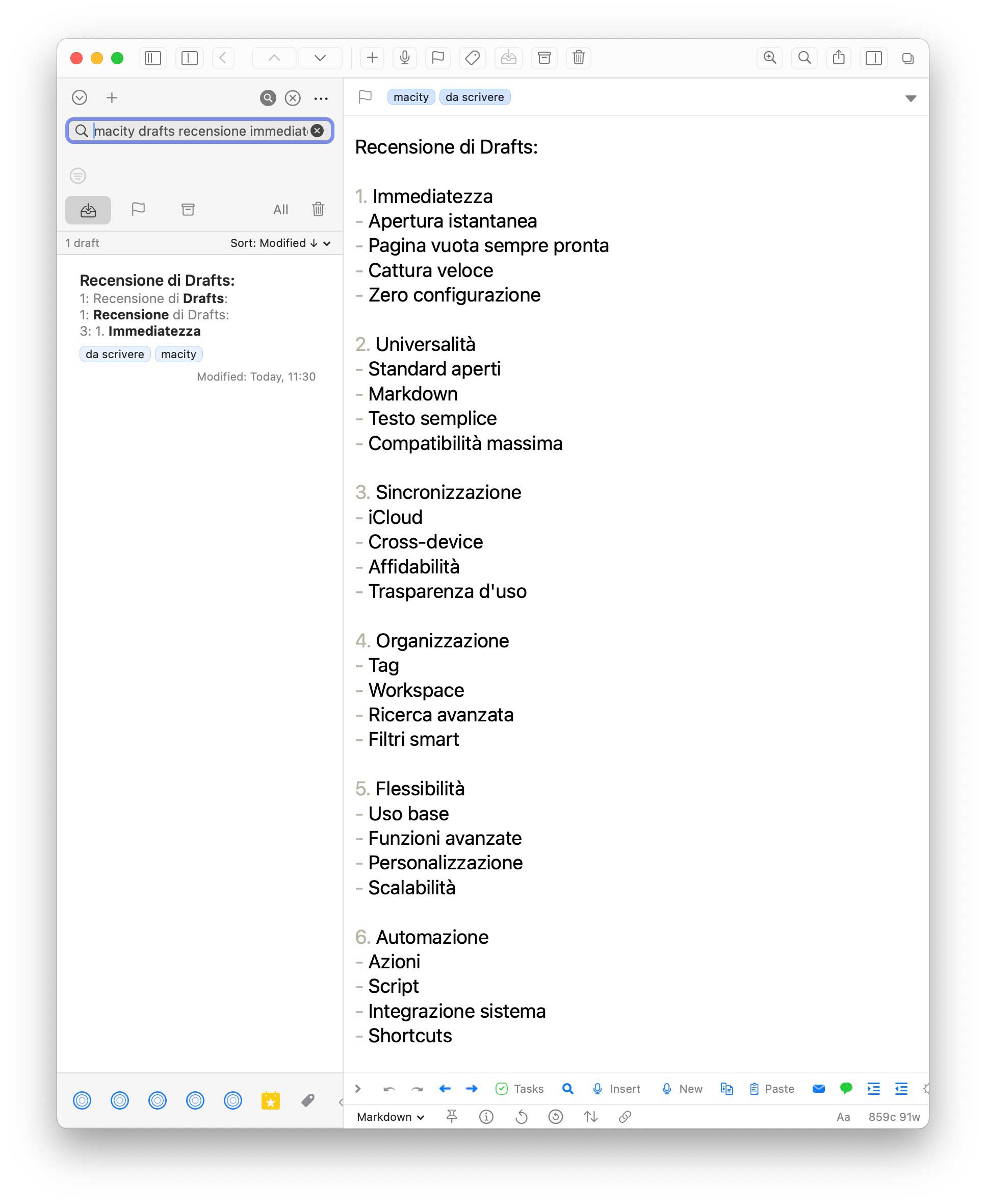 L’applicazione, disponibile come detto per Mac, iPhone e iPad, è diventata nel corso degli anni uno strumento indispensabile per molte persone che lavorano con il testo. Che si tratti di prendere appunti durante una conferenza stampa o una lezione, organizzare una lista della spesa o preparare il testo di un articolo da pubblicare su WordPress, Drafts offre una soluzione elegante e affidabile. La sua versatilità la rende adatta sia al giornalista che deve catturare velocemente una dichiarazione sia allo scrittore che deve organizzare le idee per un romanzo, con tutto quel che c’è nel mezzo (nel bene e nel male).