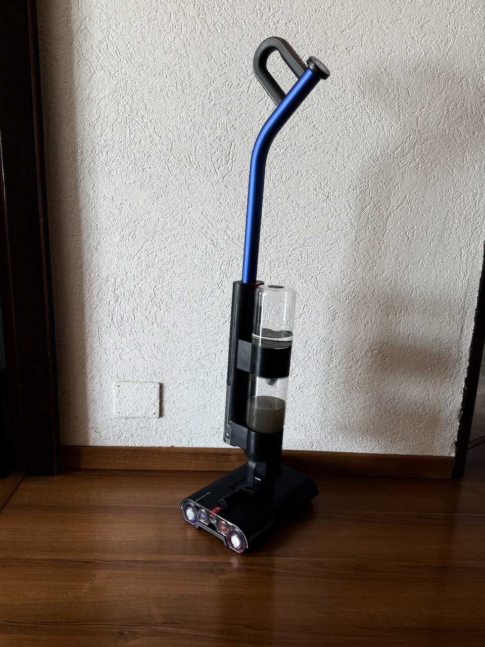 Il WashG1 ha una sua “casa” dove riporlo, che serve anche a separare le spazzole umide dal pavimento. La stazione di ricarica è ben progettata e ospita comodamente il dispositivo, attivando automaticamente il ciclo di autopulizia quando necessario. L’impugnatura è ergonomica e il piccolo display fornisce informazioni essenziali sui livelli di pulizia e lo stato della batteria.