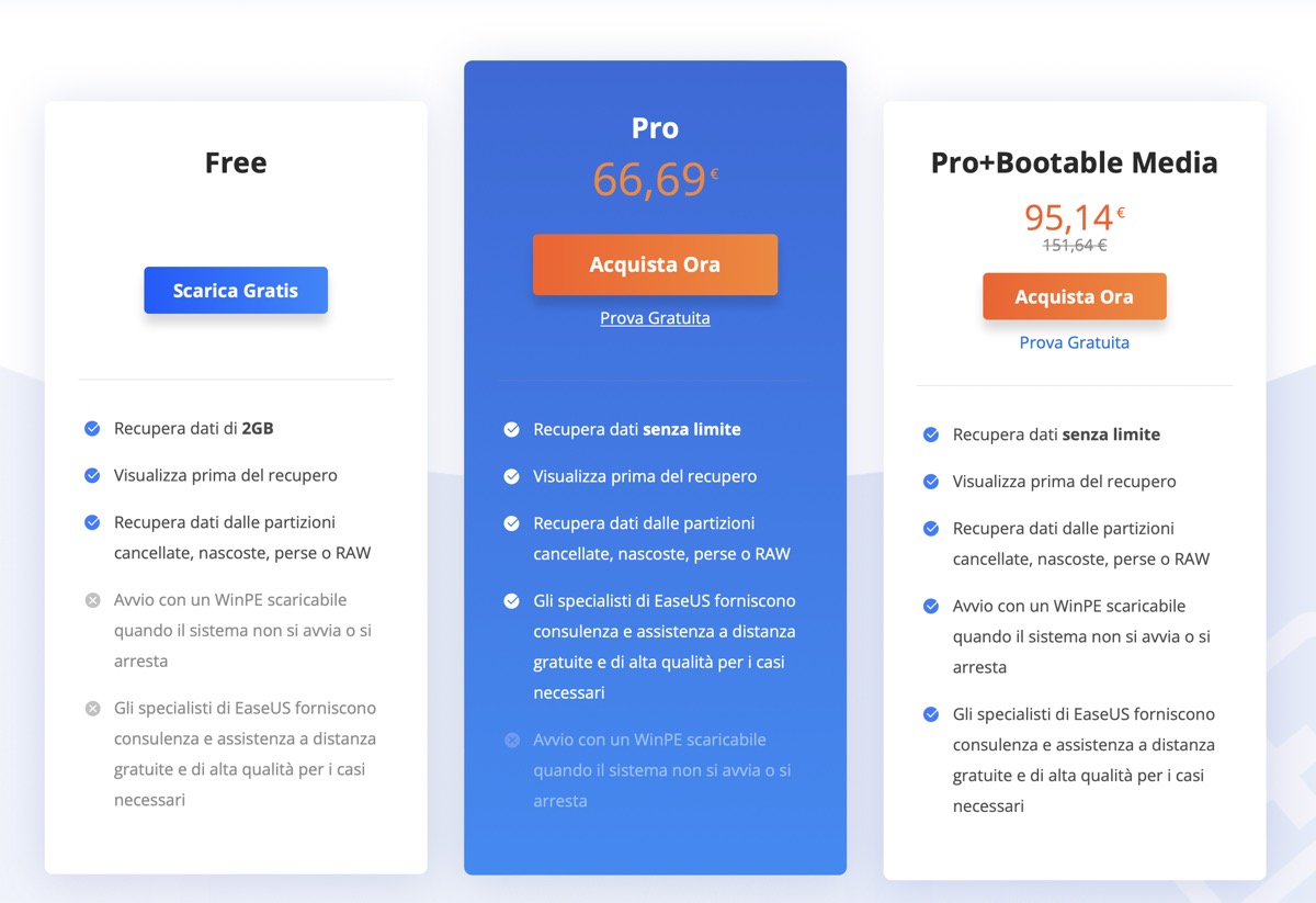 EaseUS Data Recovery Wizard è un software gratuito, anche se è possibile acquistare funzionalità a pagamento. Di seguito potete vedere tutte le versioni a confronto. Già la versione gratuita è un ottimo banco di prova per capire se l’applicativo può fare al caso vostro. Senza spendere soldi potrete recuperare dati fino a 2GB, visualizzare l’anteprima prima del recupero, ed effettuare anche un recupero da partizioni cancellate, perse o nascoste.