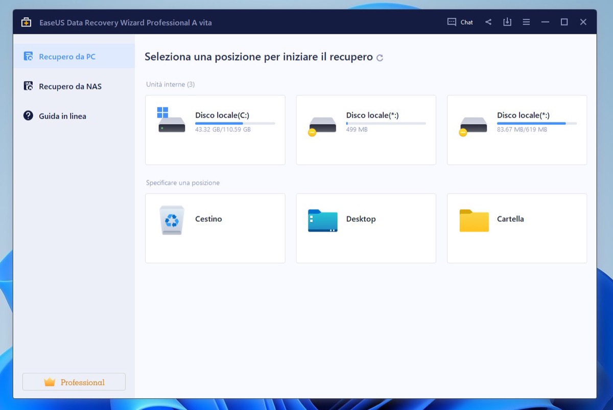 Il funzionamento è davvero semplice ed immediato, e con pochi passaggi sarà possibile procedere al recupero dei file. Anzitutto, EaseUS Data Recovery Wizard funziona come un semplice Esplora Risorse, o anche come un qualsiasi Finder, molto simile a quando si esplorano le cartelle su un PC.