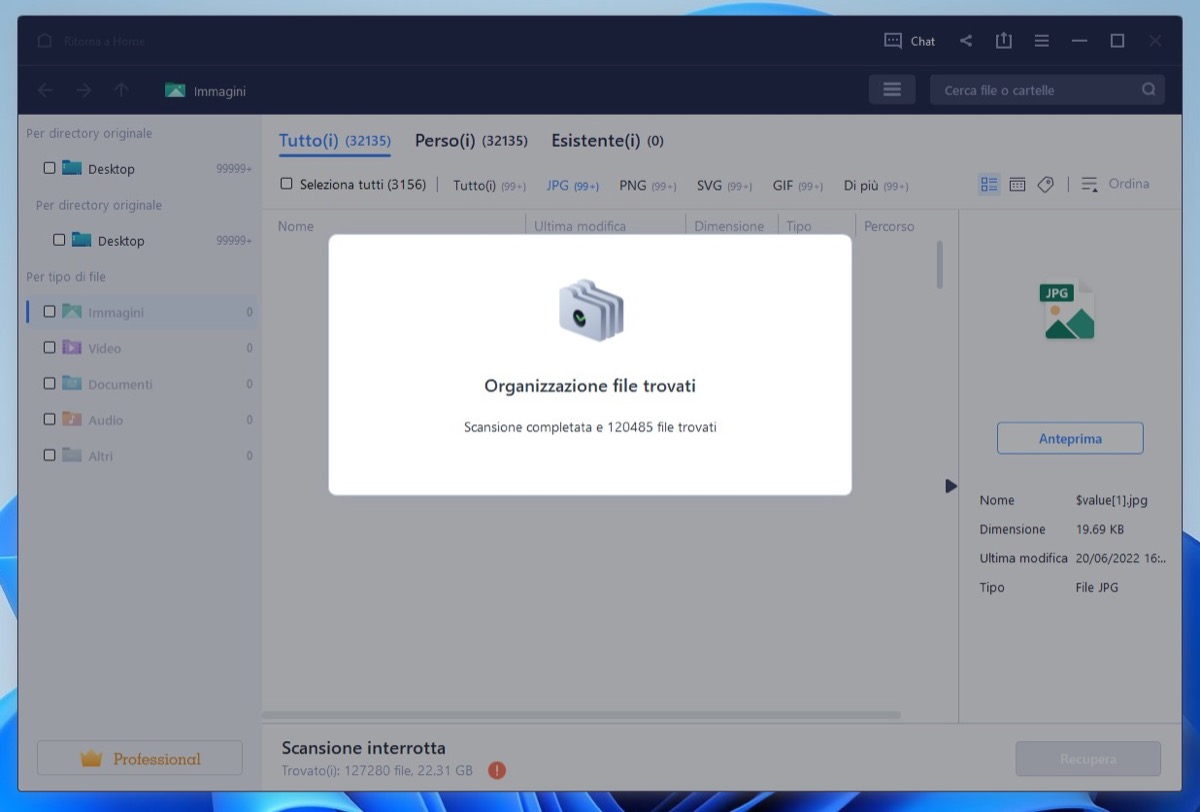 Una volta scelto il disco, o la cartella da controllare, l’applicativo inizierà la ricerca dei file recuperabili. A completamente della scansione si aprirà un vero e proprio Esplora Risorse vecchio stampo, simile anche al Finder di Apple, dove sulla sinistra saranno visibili, oltre alle directory dove sono presenti i file recuperati, anche le tipologie di file recuperati.