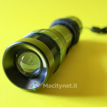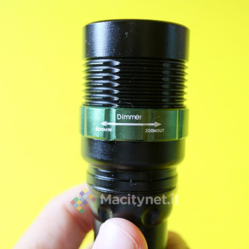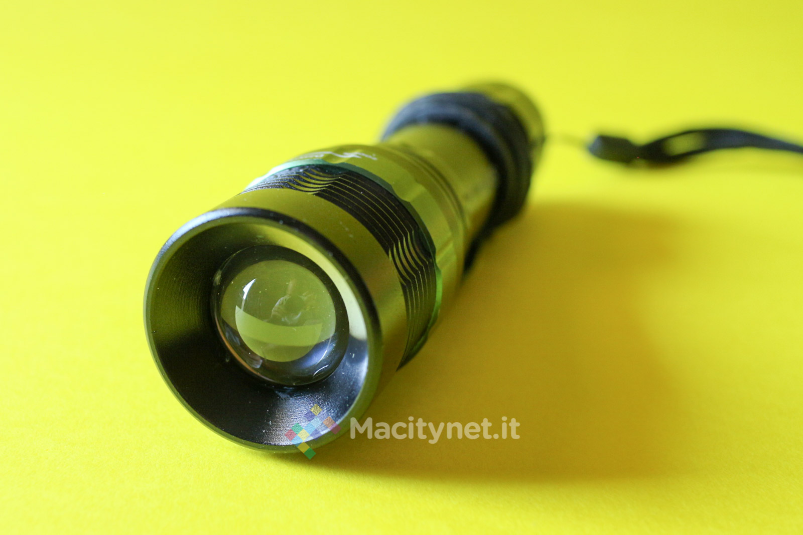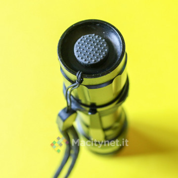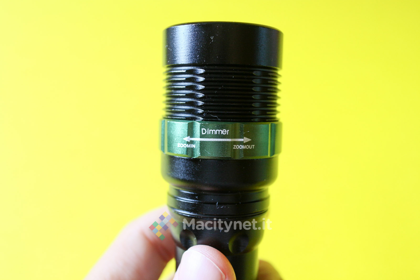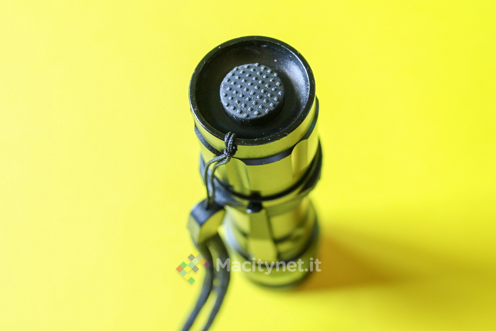 Sul retro troviamo un unico pulsante che, se premuto a fondo, accende e spegne la torcia. Se lo si preme invece fino a metà corsa, permette di cambiare le varie modalità, passando da una luce forte (100%) ad una più debole (circa 50%), fino alla modalità strobo per una serie di lampeggi, utile come luce per segnalare magari una emergenza. Oltre alle varie modalità, si può anche regolare il fascio di luce semplicemente ruotando l’anello di metallo verde posto in prossimità della testa della torcia. La rotazione di questa componente non fa altro che allontanare o avvicinare il vetro protettivo, una lente di ingrandimento che, per farla breve, aumenta o diminuisce la dimensione del cono di luce. Una superficie illuminata più ampia avrà una luce “più debole”, viceversa, concentrando tutta la luce in un’area più ristretta si avrà una luce più intensa.