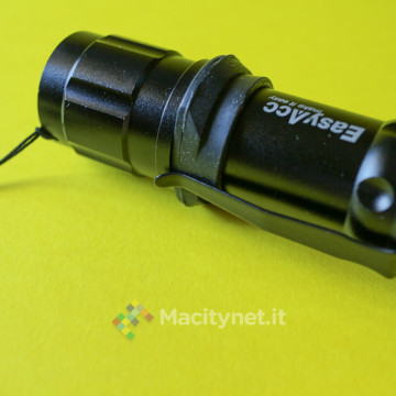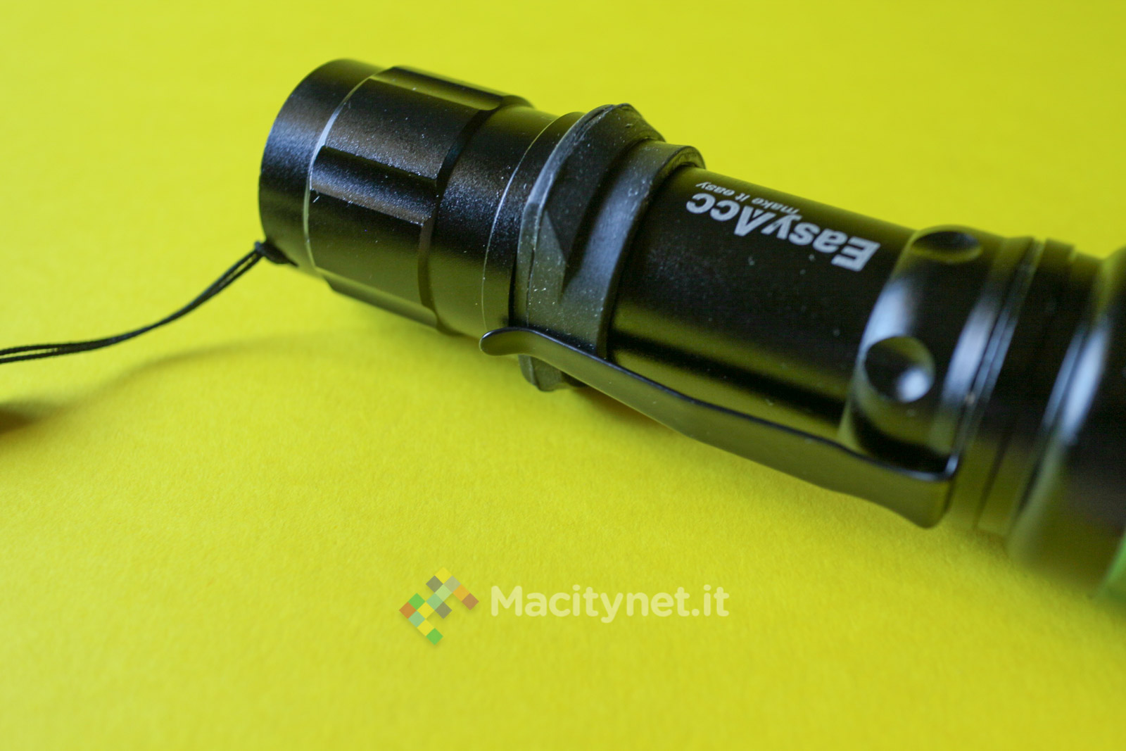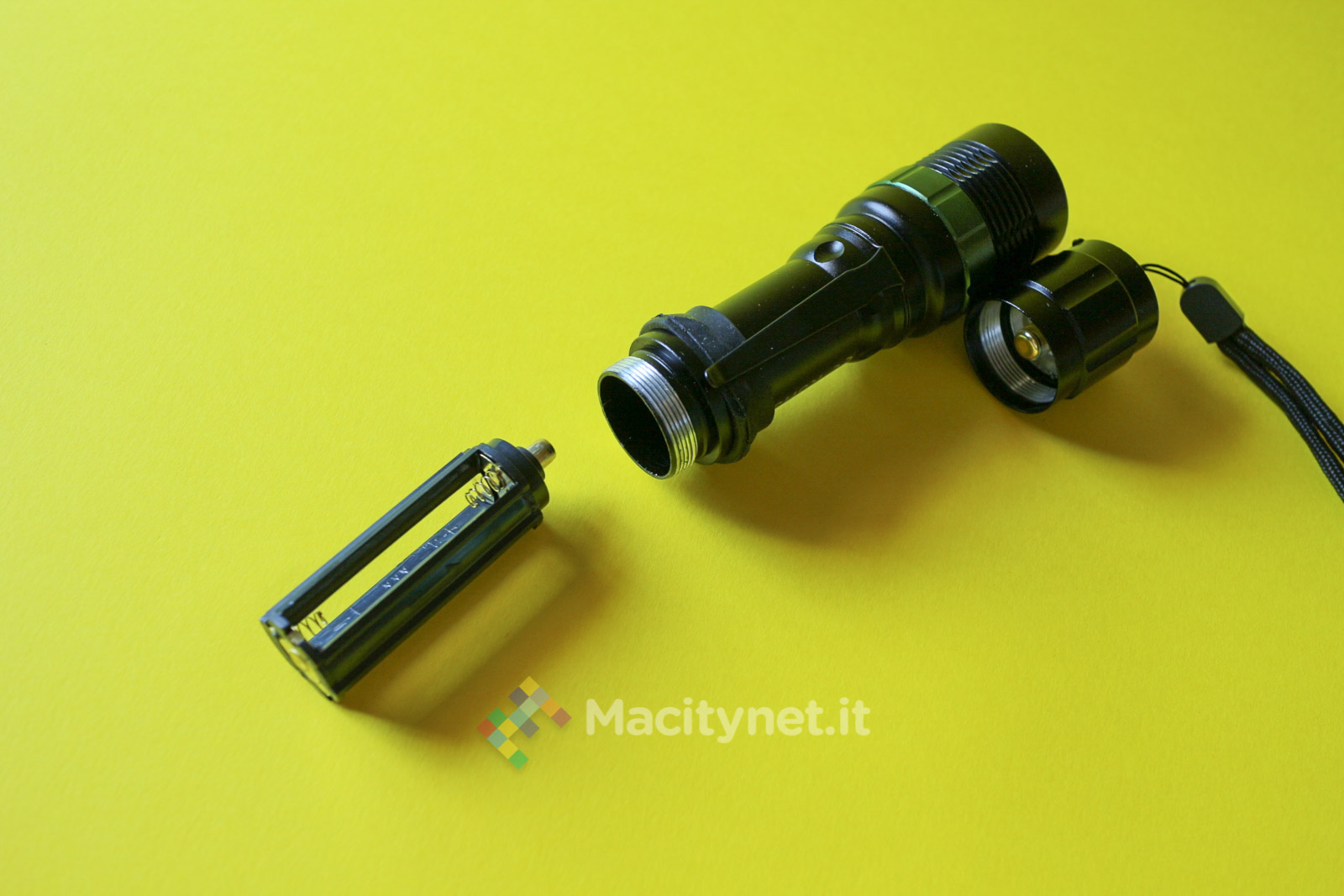 Mentre la maneggeremo ci renderemo subito conto che si tratta di un prodotto solido e resistente. E’ compatibile con le batterie 18650 (più grandi delle AA) ma può eventualmente essere utilizzata con 3 ministilo AAA grazie all’apposito adattatore incluso nella confezione. Lungo il manico troviamo una clip, anch’essa in metallo, che permette di agganciarla rapidamente alla cintura dei pantaloni, ma se non ci piace o non ci serve, si potrà tranquillamente rimuovere svitando la testa della torcia.