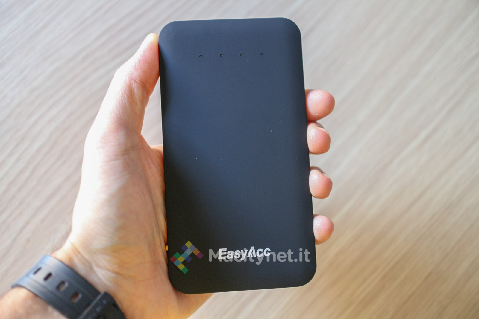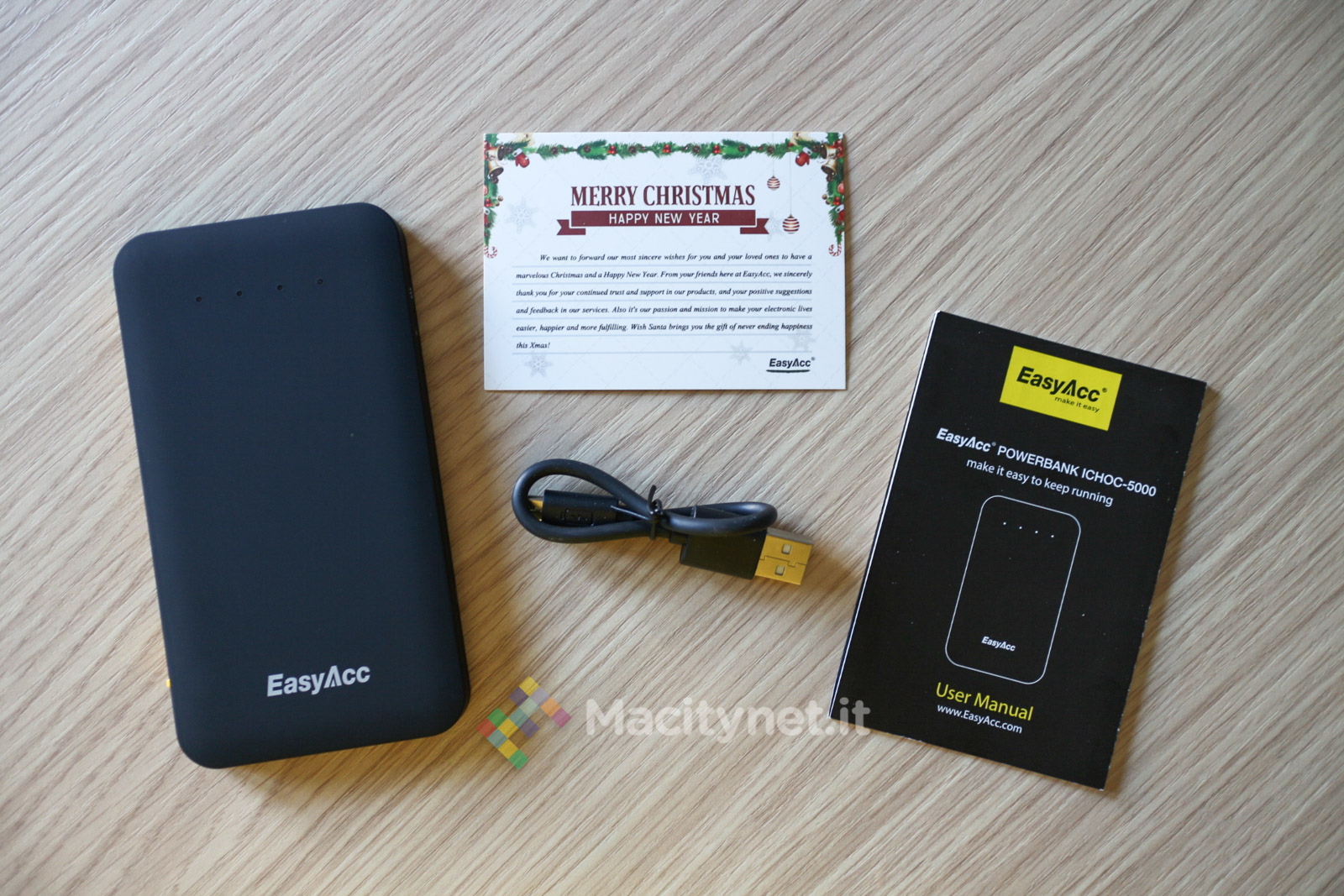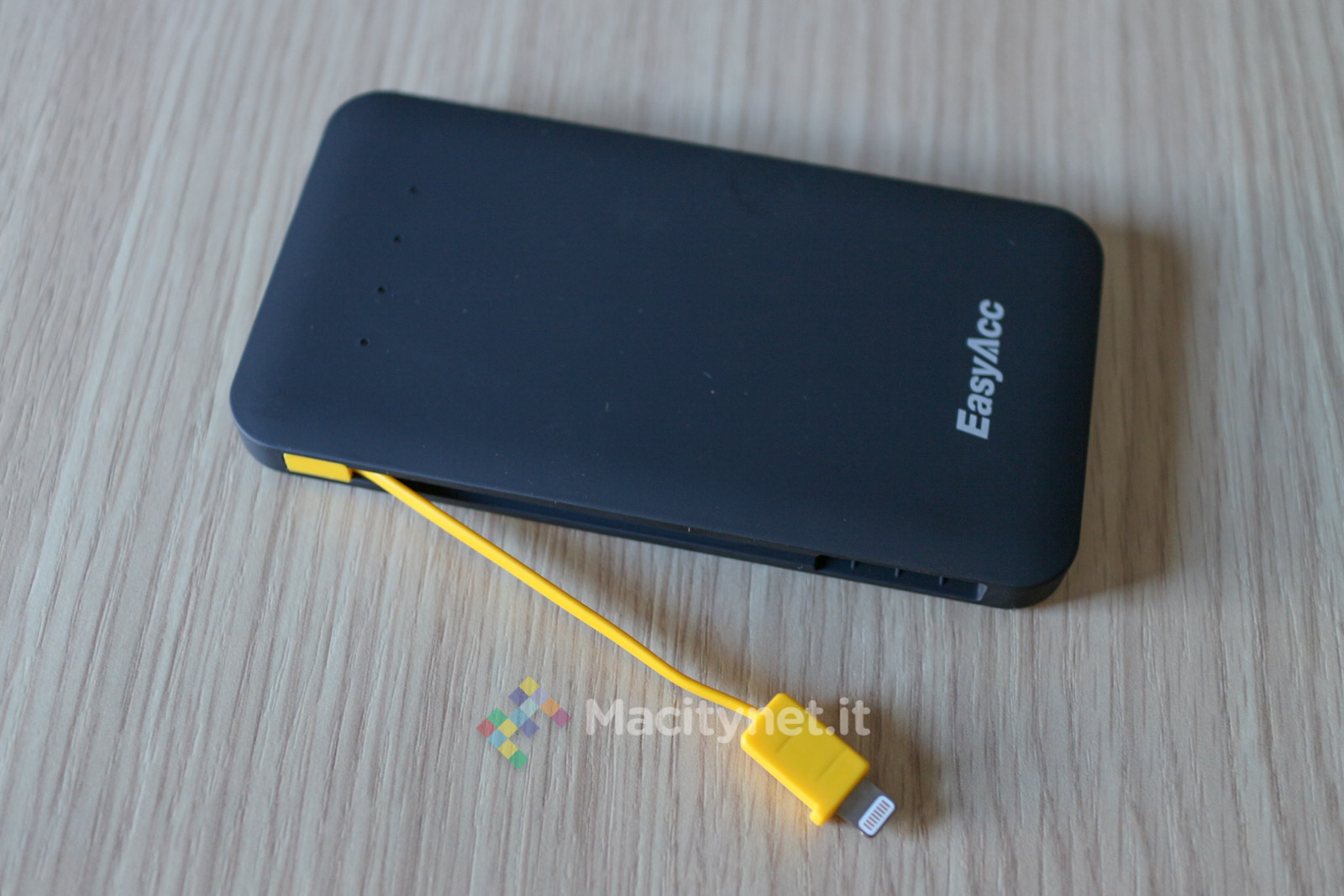 Ma quale scegliere? sul mercato ce ne sono diverse che variano per forma, dimensioni, capacità e funzioni offerte. La EasyAcc ICHOC-5000 che la nostra redazione ha messo in tasca queste ultime settimane è probabilmente tra le più interessanti soluzioni all-in-one perché, per l’appunto, offre già tutto ciò di cui si può aver bisogno per utilizzarla durante l’arco della giornata. Differentemente dalla maggior parte delle altre batterie concorrenti, questa è infatti dotata di un cavo Lightning incassato in uno lato: ciò significa che anche i più distratti non dovranno più ricordarsi di portare anche il cavetto, i più disordinati non dovranno perdere preziosi minuti nel cercarlo nei meandri dello zaino per poi doverlo snodare perché irrimediabilmente aggrovigliato.