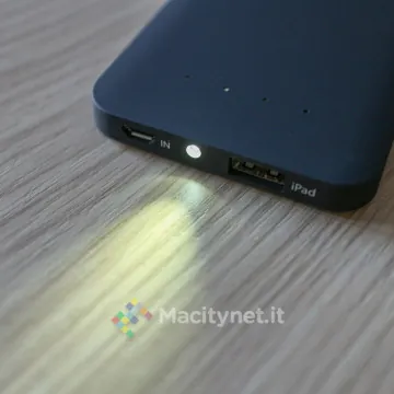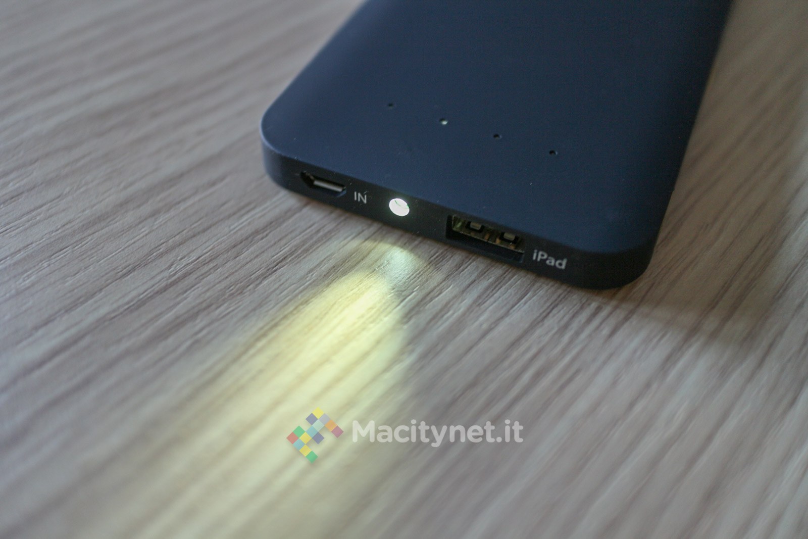 Basta questa batteria, grande quanto un iPhone 6 (13 x 7 centimetri) e leggermente più spessa (0,7 centimetri), è già pronta all’uso. Il peso poi, di appena 135 grammi, la rende del tutto tascabile. La cassa esterna è in plastica, con una copertura gommata che ne migliora la presa: da un lato troviamo l’uscita USB segnalata dalla dicitura iPad che semplicemente ricorda la capacità di erogare fino a 2 A, affiancata dall’ingresso microUSB per la ricarica della batteria ed una piccola lampadina con la funzione di torcia d’emergenza. Per accendere quest’ultima è sufficiente fare un doppio click sul tasto laterale che, se viene invece premuto una sola volta, accende i 4 LED blu frontali utili per conoscere la quantità di energia residua (ciascuno rappresenza il 25% di carica).