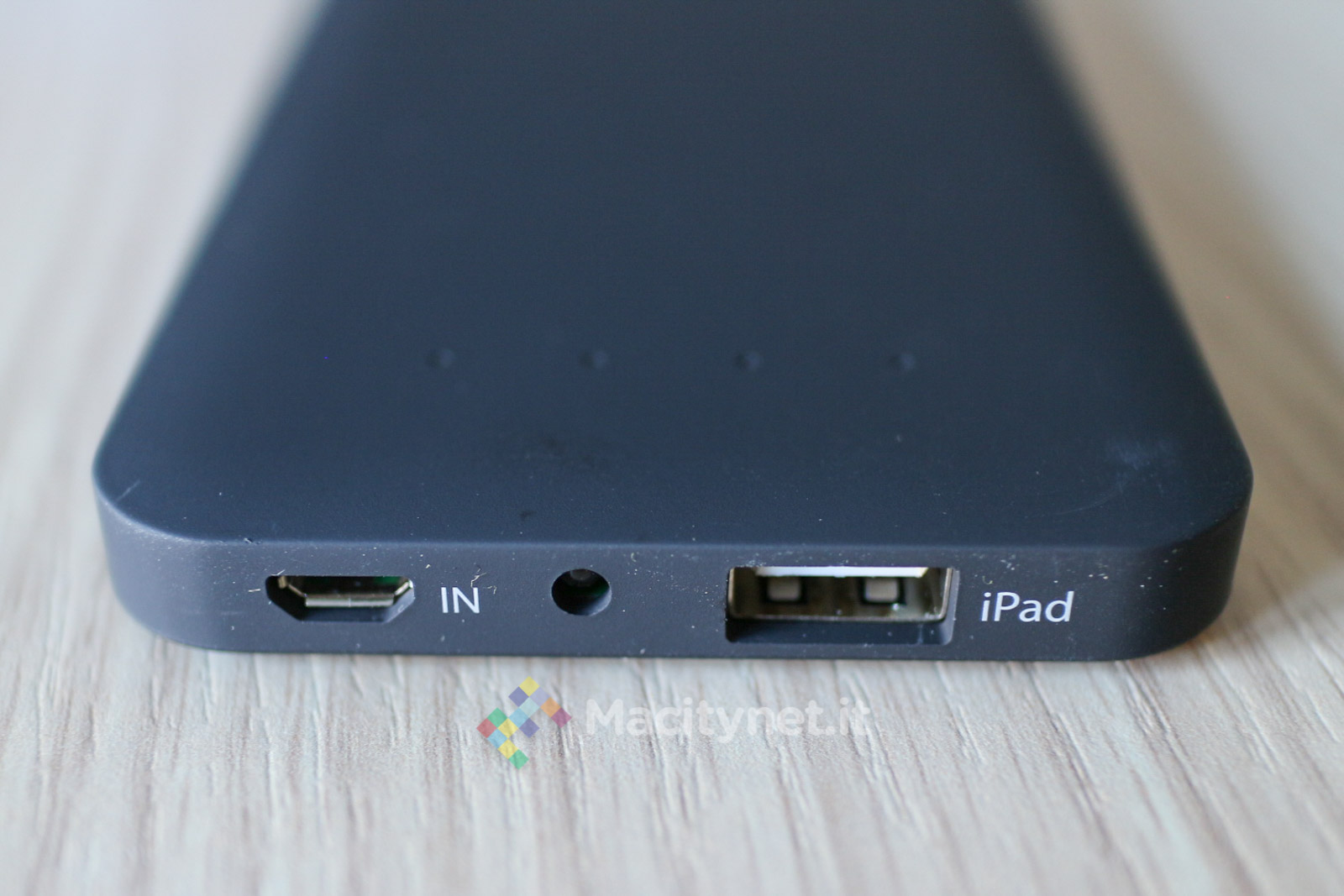 La caratteristica più interessante però, come detto, sta nella possibilità di estrarre il cavo Lightning incassato lateralmente: sul manuale utente leggiamo che da questo la batteria eroga un massimo di 2.1 A, quindi è compatibile anche con iPad. Non possiamo collegare per ovvie ragioni l’amperometro digitale per verificarne l’effettiva potenza, tuttavia siamo riusciti a ricaricare il 5% di iPad alla stessa velocità con cui la medesima percentuale viene ricaricata utilizzando l’alimentatore originale. Allo stesso modo, collegando iPhone 6 Plus, si riesce a ricaricare il telefono quasi nella metà del tempo, confermando che dal cavo incorporato i dispositivi collegati riescono ad assorbire fino a 2 A.