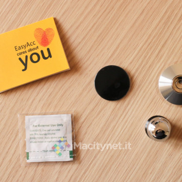 Cosa rende speciale EasyAcc MWCAR-BMAG lo si capisce sfogliando le foto nella galleria che alleghiamo alla recensione. Si tratta sostanzialmente di una sfera di metallo che collabora con una piastra magnetica: quest’ultima si fissa sul retro del telefono attraverso una speciale “ventosa in gel” molto appiccicosa che può essere attaccata e staccata più e più volte e, lavandola con un po’ d’acqua quando comincia ad attaccare meno, riacquista tutte le proprietà adesive apprezzate al primo unboxing (inclusa nella scatola c’è comunque una seconda “ventosa” sostitutiva).
