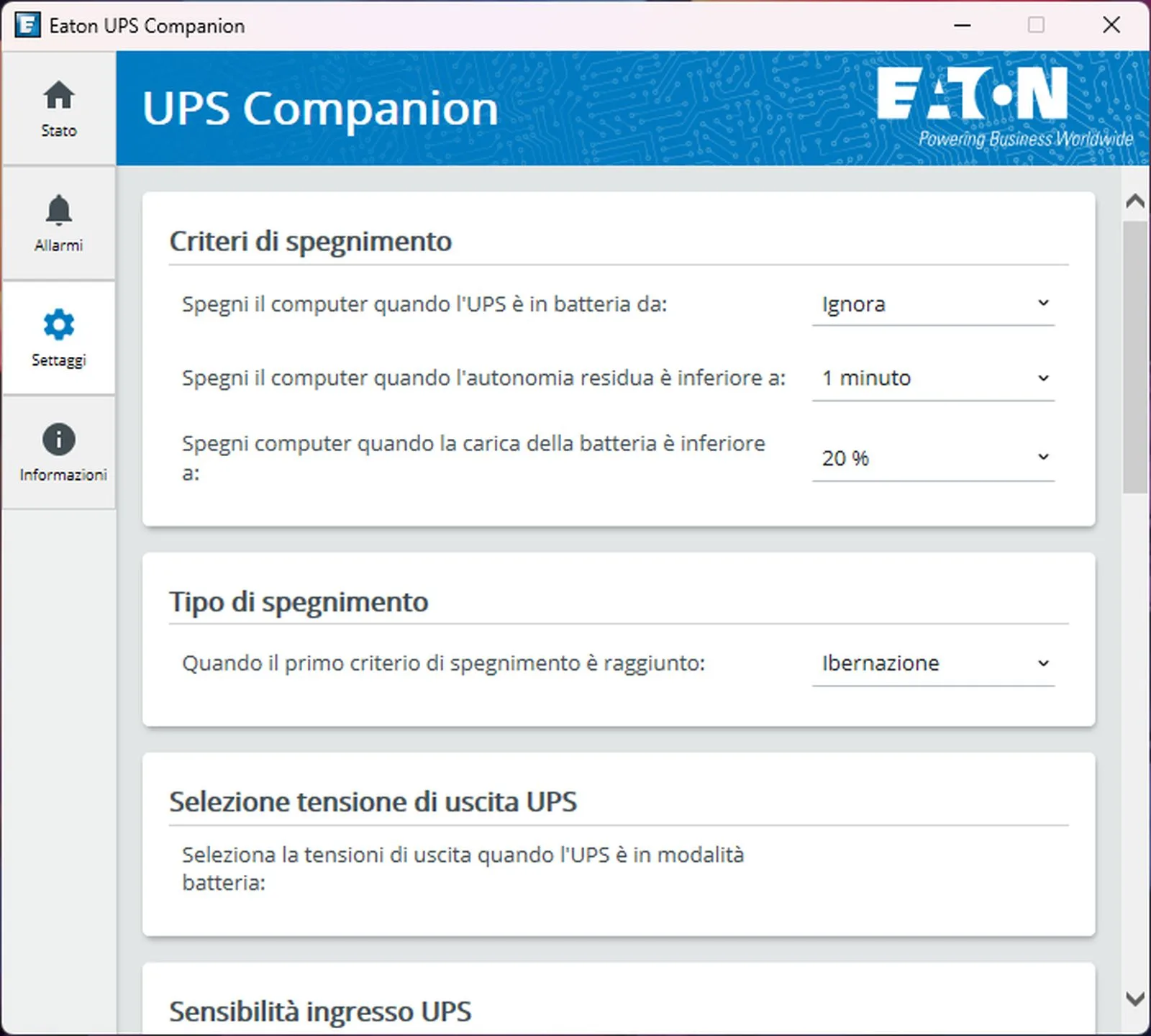 Nei pannelli presenti possiamo controllare lo stato della batteria interna (un check ogni sei mesi è comunque doveroso), la potenza che consumano tutti i device, per capire se siamo all’interno del range, eventuali aggiornamenti software e del firmware e anche come si deve comportare l’UPS in caso di funzionamento a batteria.