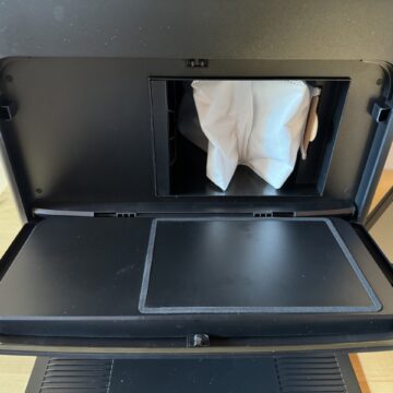 Grande, ma allo stesso tempo compatta ed esteticamente curata. E’ alta ben 525,5 millimetri, spessa 443 mm e larga 392 mm. Sulla parte frontale è presente uno scompartimento, che si apre con una leggera pressione. Qui è presente il sacchetto per la polvere, che viene riempito automaticamente svuotando la vaschetta di raccolta presente nel robot. Sulla parte alta, invece, è presente il vano che contiene le due vasche di raccolta per l’acqua: quella sporca e quella pulita.