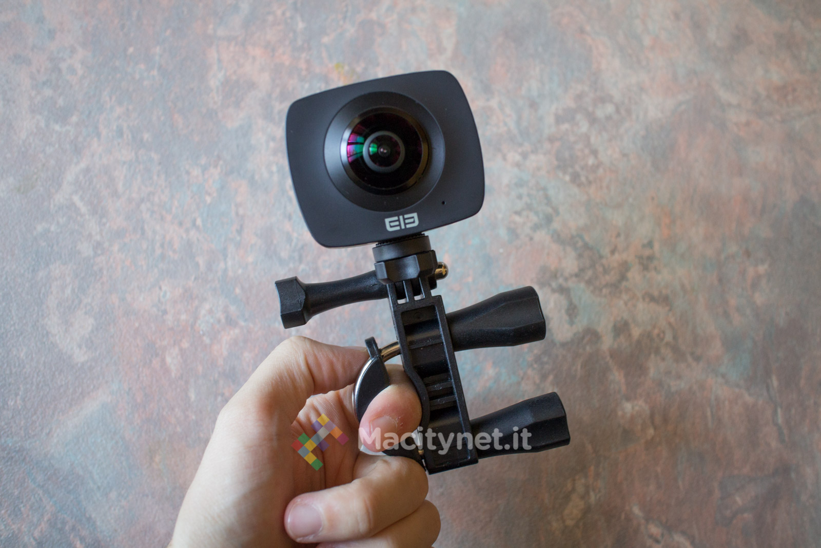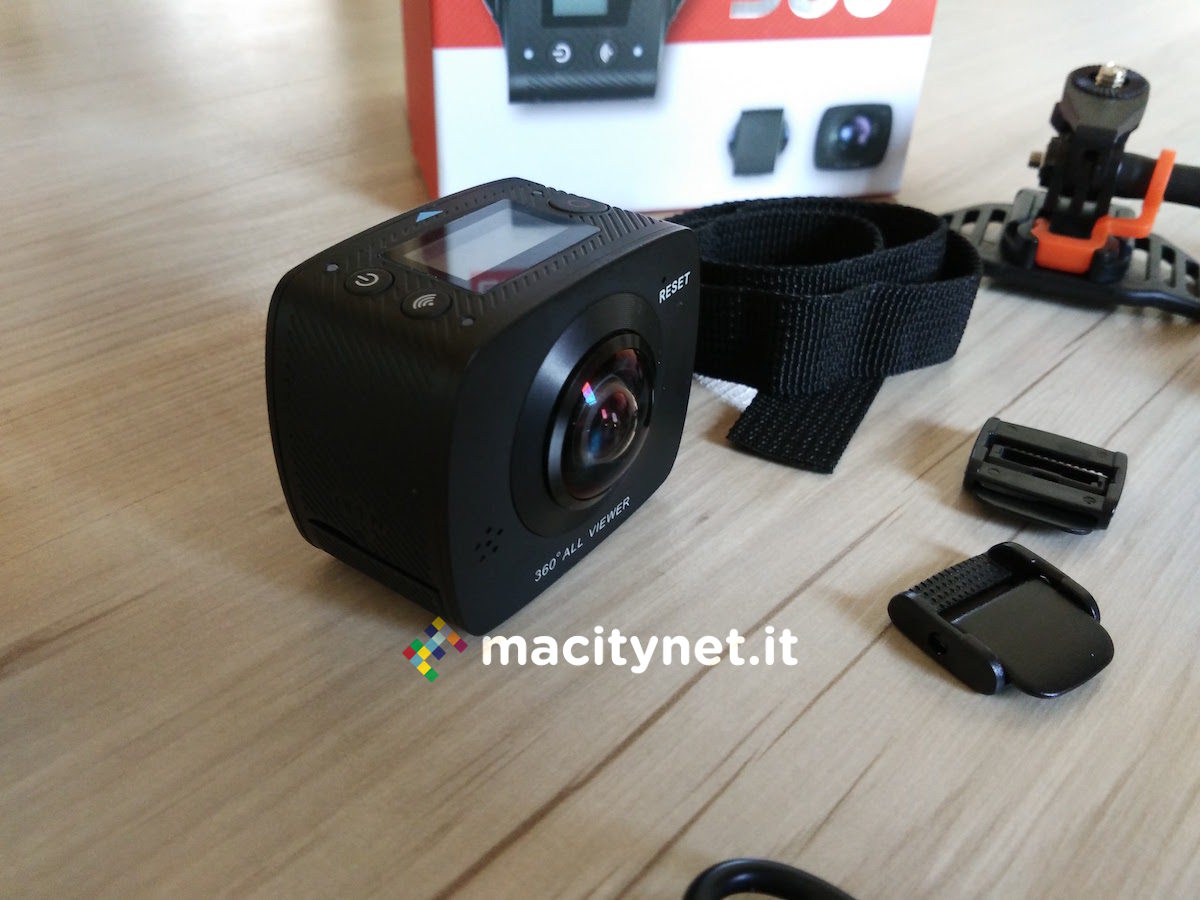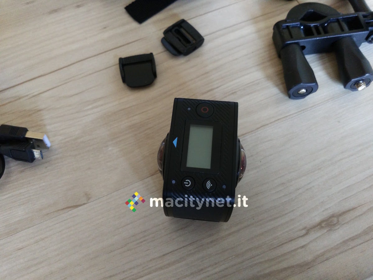 L’action camera EleCam 360 monta al suo interno una CPU SPCA6350M e due sensori fotocamere OV4689, con apertura focale F 2.0 e lunghezza focale effettiva f=1.1mm. L’angolo di visuale di ambo le camere, posizionate ai lati della periferica, è di 220 gradi, mentre sulla parte superiore svetta un piccolo display LCD da 0.96 pollici, con risoluzione 128×64 pixel, che naturalmente non serve per vedere cosa sta riprendendo esattamente la fotocamera, bensì solo per le informazioni di servizio, come il tempo di registrazione, il numero di foto che la MicroSD può contenere o i minuti residui. Sul lato basso, invece, sono posizionati ingressi MicroSD e MicroUSB per ricaricare la batteria integrata da 1500 mAh, sulla cui longevità torneremo a breve.