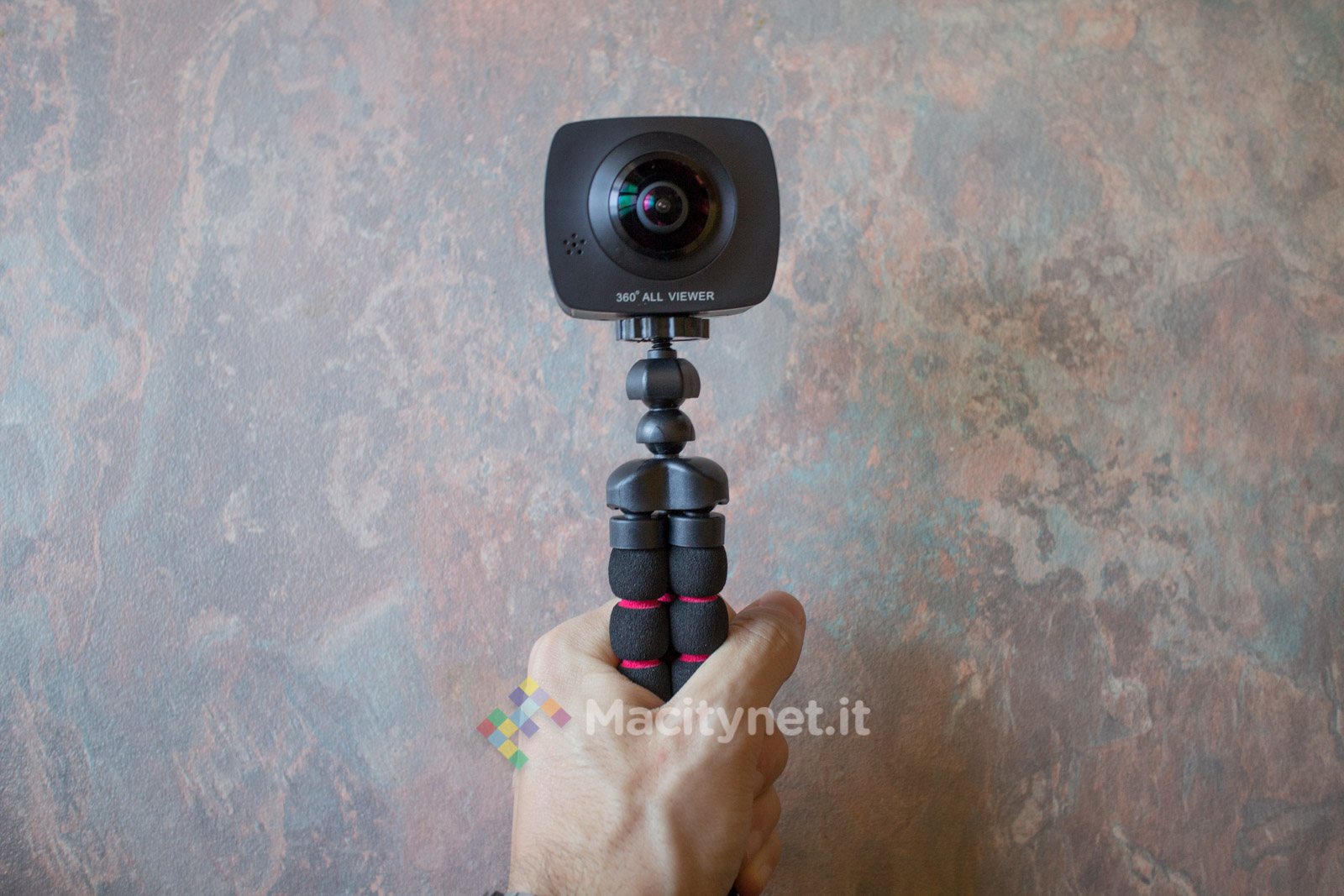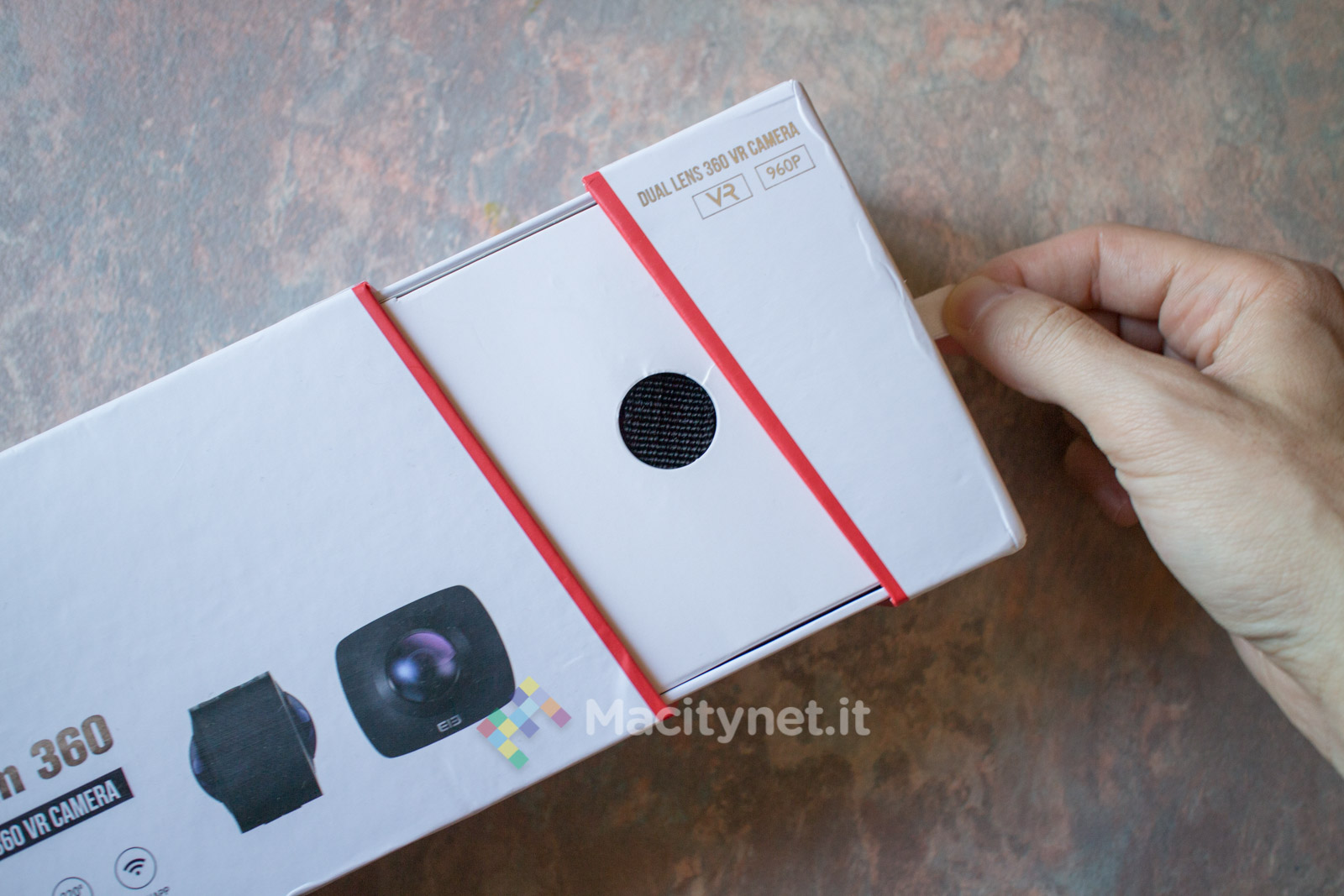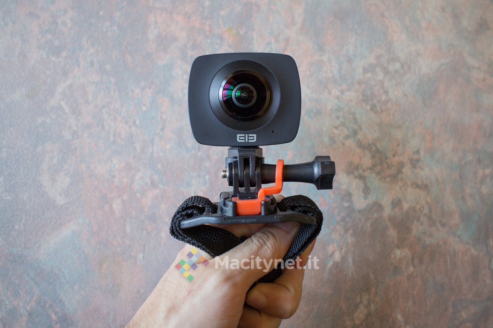 L’action camera EleCam 360 monta al suo interno una CPU SPCA6350M e due sensori fotocamere OV4689, con apertura focale F 2.0 e lunghezza focale effettiva f=1.1mm. L’angolo di visuale di ambo le camere, posizionate ai lati della periferica, è di 220 gradi, mentre sulla parte superiore svetta un piccolo display LCD da 0.96 pollici, con risoluzione 128×64 pixel, che naturalmente non serve per vedere cosa sta riprendendo esattamente la fotocamera, bensì solo per le informazioni di servizio, come il tempo di registrazione, il numero di foto che la MicroSD può contenere o i minuti residui. Sul lato basso, invece, sono posizionati ingressi MicroSD e MicroUSB per ricaricare la batteria integrata da 1500 mAh, sulla cui longevità torneremo a breve.