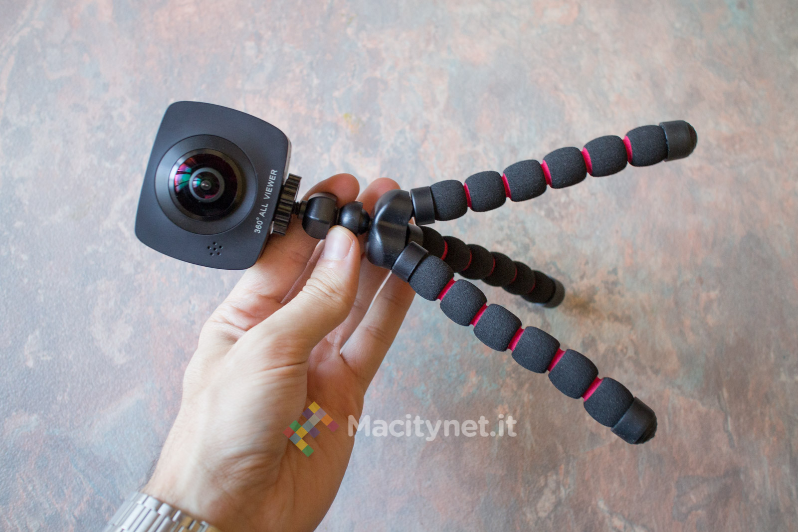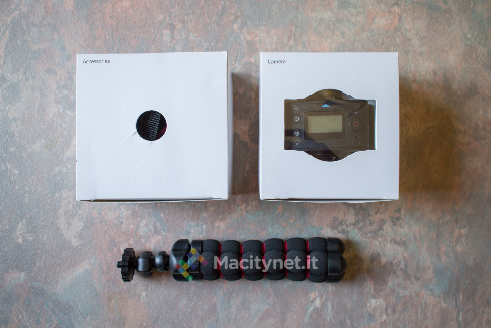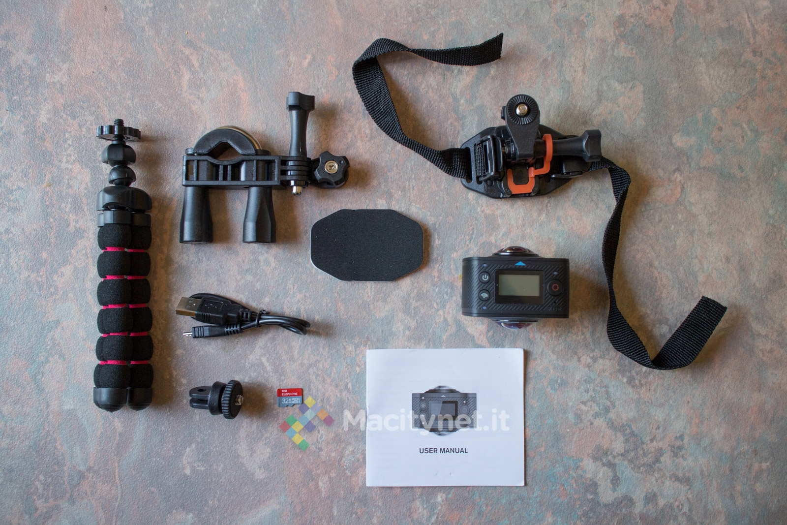 Il comparto accessori non è paragonabile a quello di altre action cam per il numero di supporti inclusi nella confezione. Oltre alla camera troviamo una microSD da 32 GB, il supporto per i manubri di bici e moto ed il più classico supporto da adattare a caschi o cruscotti di veicoli ed un pratico treppiede in miniatura, con le caratteristiche del celebre Gorillapod ma rafforzato da una copertura in gomma che migliora la tenuta sulle superfici lisce.