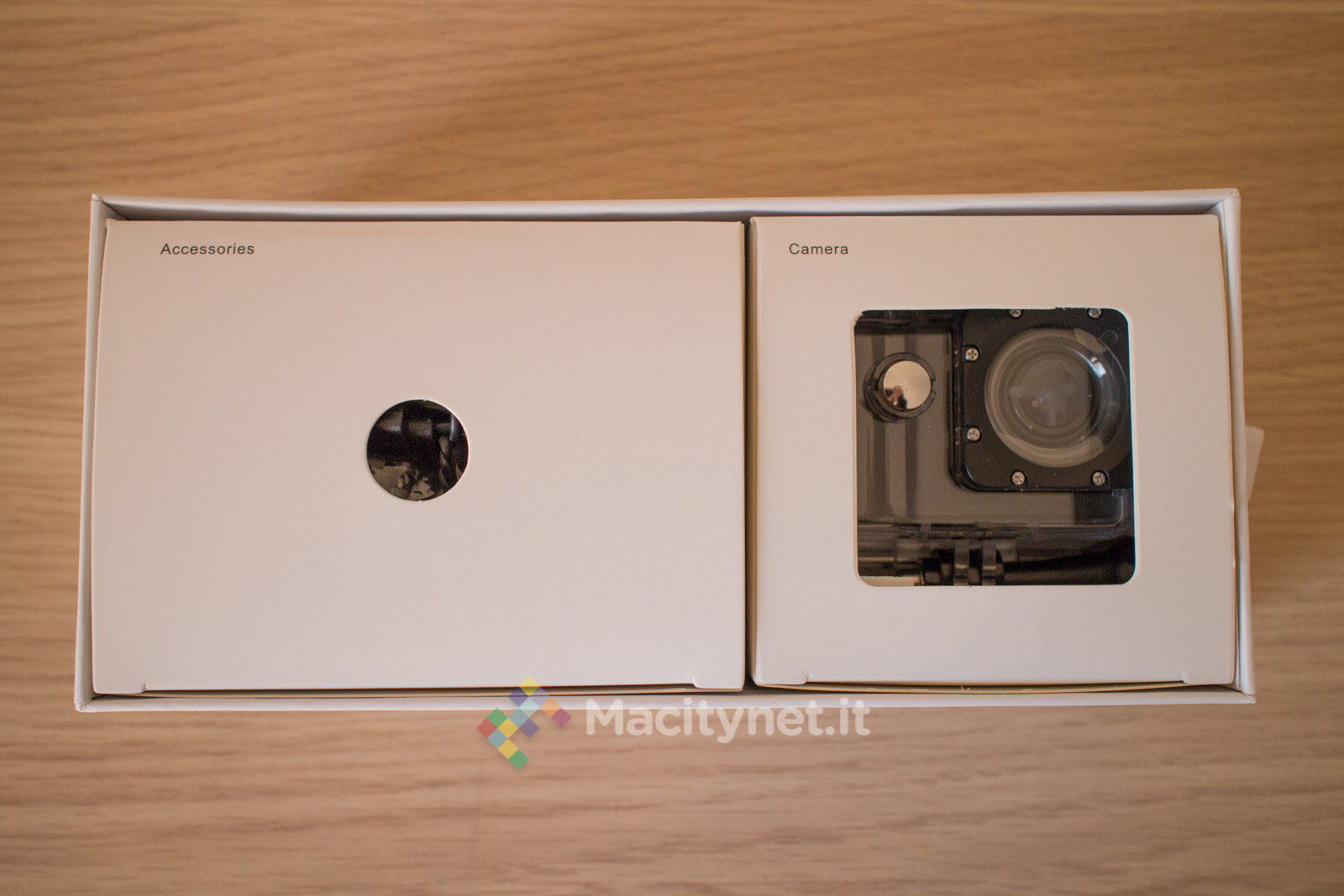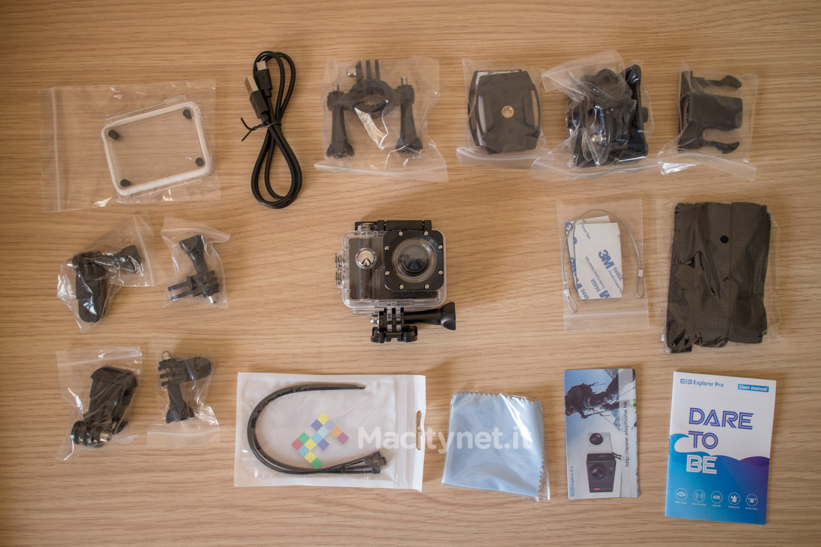 Il comparto accessori che accompagna questa telecamera è lo stesso che troviamo nella gran parte delle action cam di produzione orientale e comprende due piastre adesive, di cui una con filettatura a vite 1/4’’, che eventualmente si possono stabilizzare su un casco da cross con alcune fascette. Ci sono poi la cover subacquea ed una, con tanto di clip da cintura, per agganciarla ai vari supporti liberandola dalla cover impermeabile (di cui troviamo anche incluso uno sportello di ricambio). Non mancano l’attacco per tubi e manubri, alcuni adesivi sostitutivi, una pezza per pulire lente e display, alcune fascette ed una serie di attacchi di diverse dimensioni, viti incluse, che ampliano le possibilità di sistemazione della telecamera in base all’uso che se ne intende fare.