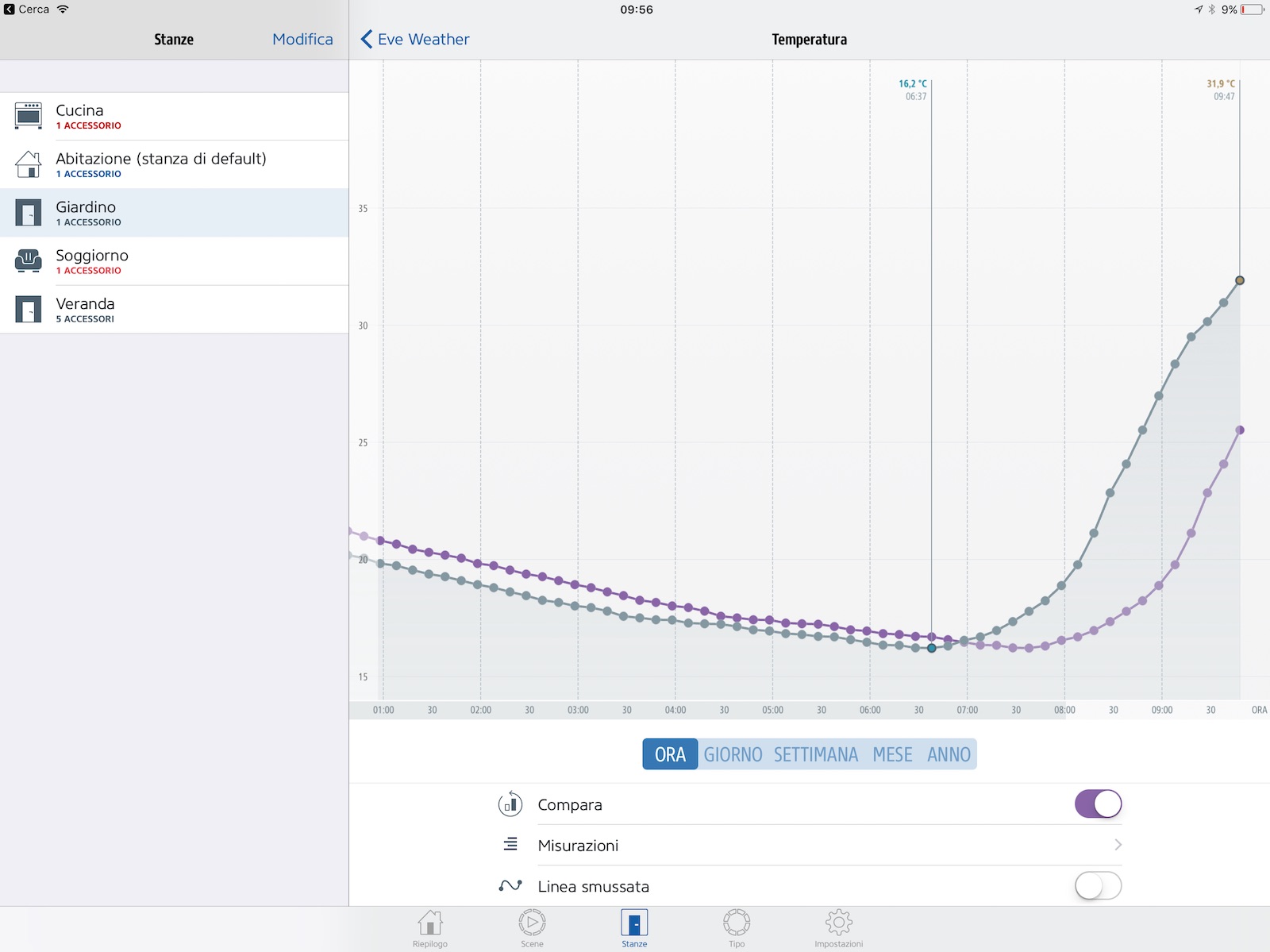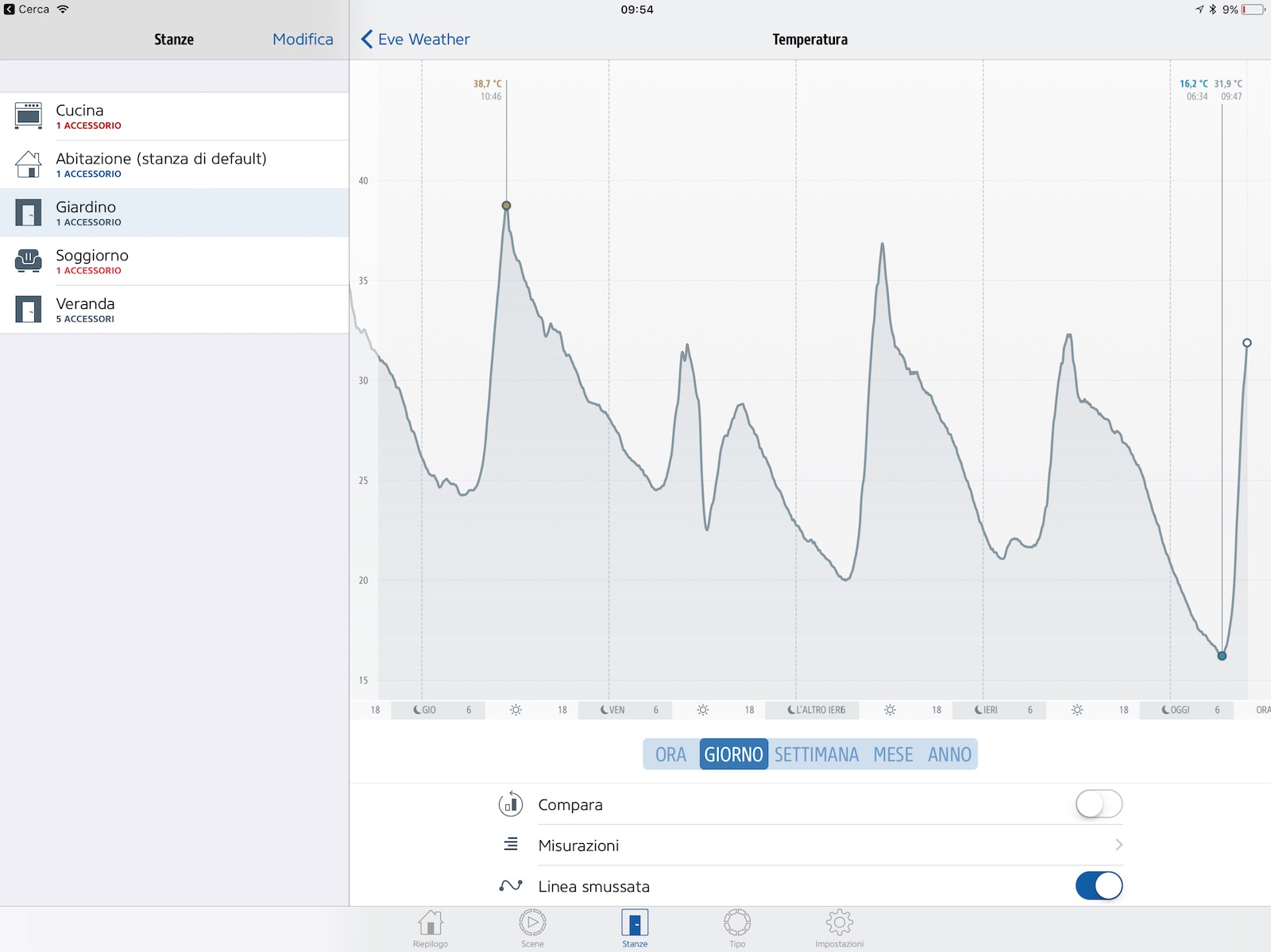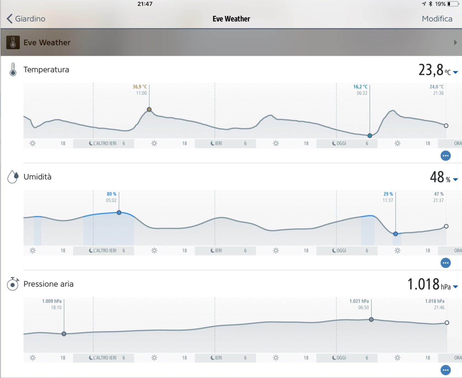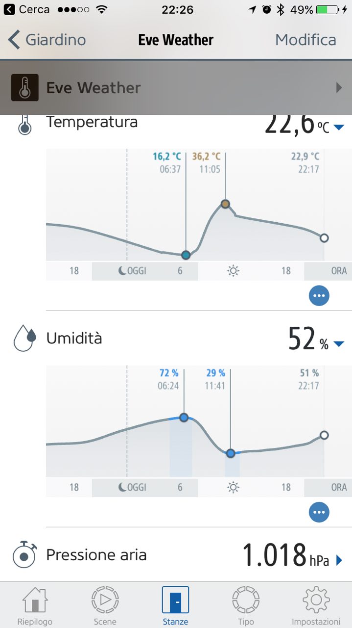 Inoltre l’app “eve” è in grado di mostrare grafici dettagliati di tutta l’evoluzione di temperatura, umidità e pressione barometrica e persino