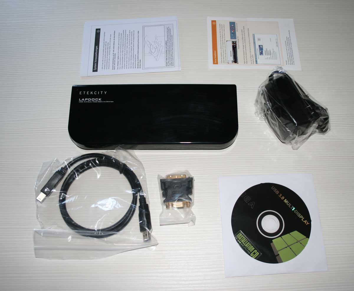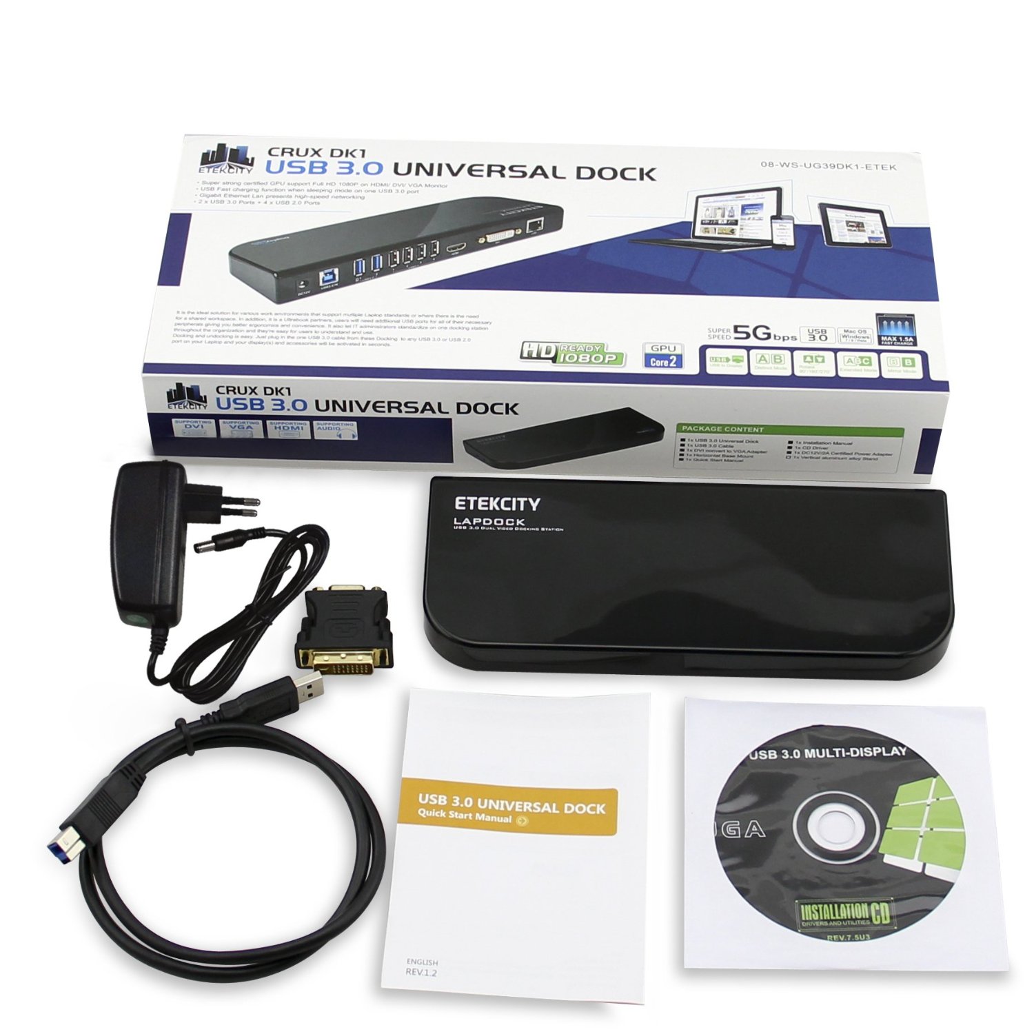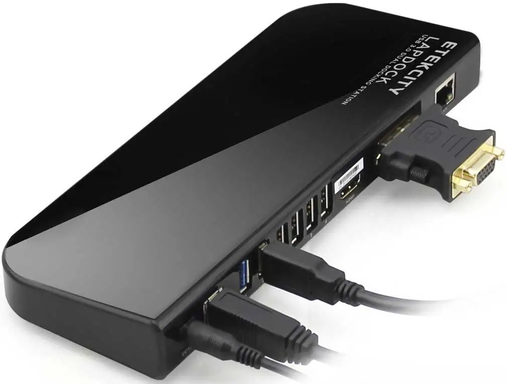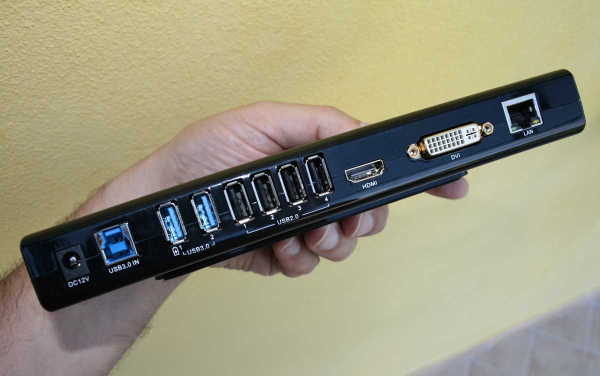 Un dock che abbiamo avuto modo di provare è il Lapdock di Etekcity modello WS-UG39DK1, un accessorio da collegare a una porta USB del computer e che mette a disposizione 2 uscite USB 3.0, 4 uscite USB 2.0, una porta HDMI, una porta DVI, una connessione Gigabit Ethernet (10/100/1000Mbit), 1 ingresso audio da 3.5mm (microfono), 1 uscita audo stereo da 3.5mm (cuffie, casse).