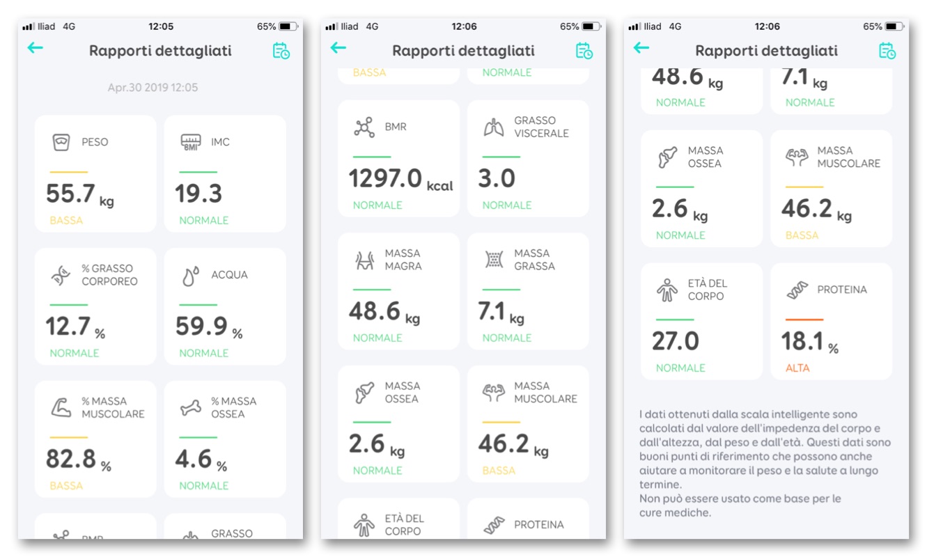 Oltre a questi parametri, già calcolati dalla precedente versione, questo nuovo modello è in grado di misurare il livello di proteine nel corpo (un basso livello può causare un indebolimento del sistema immunitario, debolezza muscolare ed anemia) e l’età, è cioè in grado di stabilire l’età del corpo (a noi ci ha ritenuti 5 anni più giovani, una piacevole soddisfazione).