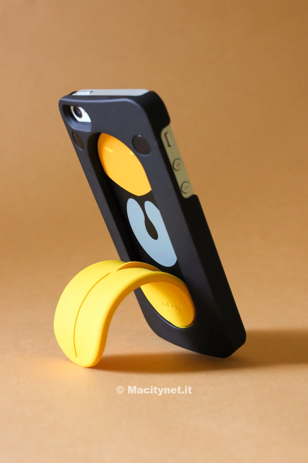 Per aprire lo stand è sufficiente esercitare una piccola pressione sulla parte alta della lingua in gomma: in questo caso il “clack” si sentirà, facendo piegare di scatto la lingua della custodia. A questo punto, oltre all’effetto sorpresa dell’animale che fa la linguaccia a chi la guarda, si avrà un pratico stand per appoggiare l’iPhone in orizzontale o verticale: si rivelerà così utile per una chiamata in FaceTime, la visione di un video, la registrazione di una nota audio o tutte quelle operazioni che permettono di utilizzare l’iPhone anche a distanza senza obbligatoriamente doverlo tenere in mano.