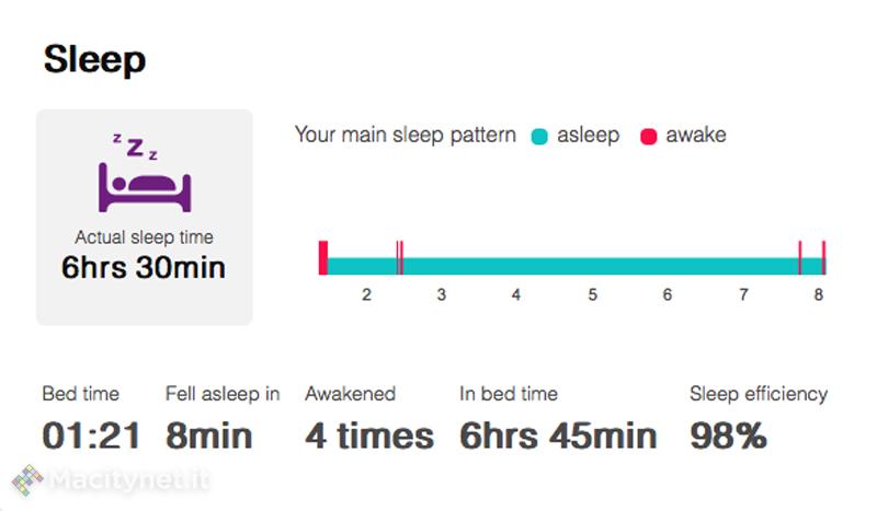 Ogni LED segnala un 20% del percorso così che, se ad esempio, abbiamo deciso di fare in una giornata 10mila passi, un LED ci dirà che ne abbiamo fatti 2000; un secondo LED che lampeggia ci dice che è in corso il raggiungimento del secondo 20% . Quando avremo raggiunto il traguardo finale, FitBit Flex vibrerà. L’accessorio è anche in grado di misurare la quantità del sonno e, parzialmente, la sua qualità (ovvero il numero di risvegli). Per attivare questa funzione dovremo picchiettare per un paio di secondi sul dispositivo che mostrerà due LED che progressivamente si spengono mentre il bracciale vibra. FitBit Flex è anche in grado di fare da sveglia “vibrante”; quando sarà giunta l’ora di alzarci, ci sveglierà senza disturbare chi dorme vicino a noi.