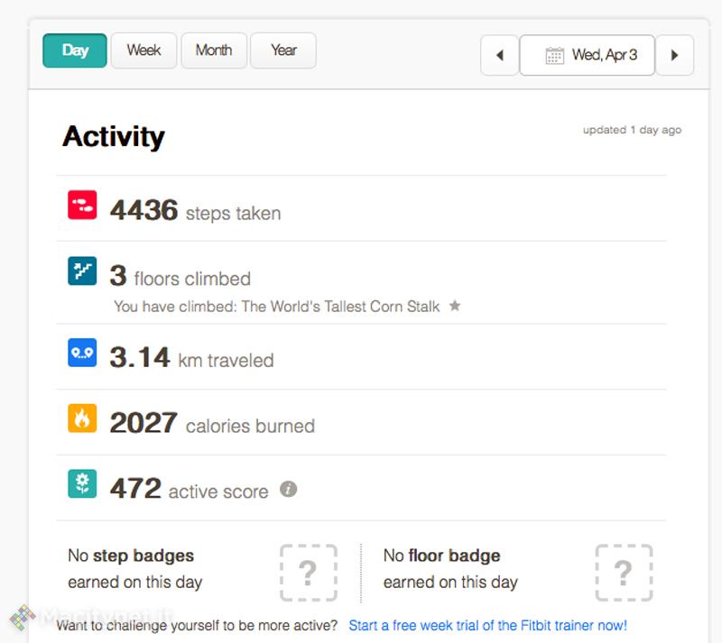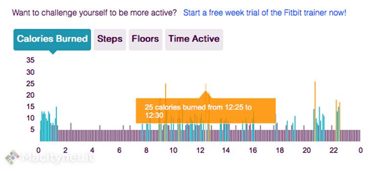 Come accennato, FitBit One sul suo display presenta poche informazioni essenziali, ma già di per sè utili a darci una idea su come sta andando la nostra giornata sotto il profilo della qualità dell’attività fisica. Sapremo ad esempio quante calorie abbiamo consumato; questo dato, intelligentemente, non è semplicemente quello che cumula il frutto dell’attività fisica vera e propria, ma anche quello che deriva dal consumo metabolico. Nonostante sul FitBit non siano presenti dati di raffronto per capire quanto siamo distanti dal target, possiamo comunque avere una idea di quanto distanti siamo, invece, dall’avere fatto i… compiti, grazie ad un fiore stilizzato che si arricchisce di foglie (in tutto ce ne sono 10) e che ci dimostra visivamente quanto siamo stati attivi in un certo momento della giornata. Il fiore diventa più “esigente”, ma mano che nel corso dei giorni la nostra attività fisica cresce e le nostre potenzialità crescono parimenti. Il display ci dice anche la distanza percorsa; questa informazione è probabilmente, assieme alle calorie, quella che susciterà maggior curiosità ed interesse. Abbiamo quindi voluto mettere alla prova la precisione del FitBit One usando come termine di paragone un Nike+ SportWatch basato su GPS, quindi molto più preciso di un pedometro, e dobbiamo dire che lo scarto tra i due dispositivi è stato sorprendentemente basso. I 10 km misurati dal Nike+ SportWatch sono stati tradotti in un caso in 10,15 km dal FitBit e in un secondo caso in 9,80 km, con uno scarto quindi del tutto accettabile. Da notare come nel pannello personale delle preferenze, sul sito Internet, è possibile tarare il pedometro, misurando la lunghezza del passo; ma nel nostro caso è stato sufficiente dichiarare la nostra altezza per avere una misurazione precisa. Poco ovviamente possiamo dire, invece, della misurazione delle calorie che nel FitBit One, come in tutti gli altri dispositivi simili è di fatto una semplice stima visto che il consumo calorico è differente da persona a persona. Nel corso della nostra prova abbiamo provato ad indossare il FitBit One sia su un mezzo pubblico che in auto, percorrendo diversi chilometri e anche qui il piccolo accessorio non ha fallito, non venendo ingannato da scossoni o sobbalzi. Puntuale anche la misurazione dei piani saliti anche se di dovrebbe parlare più correttamente di dislivello visto che ogni “piano” in realtà è una differenza di quota di 3 metri che viene rilevata sia che saliamo effettivamente della scale, sia che percorriamo una salita; FitBit è comunque sufficientemente “intelligente” da non tenere conto di un percorso in ascensore o in macchina.